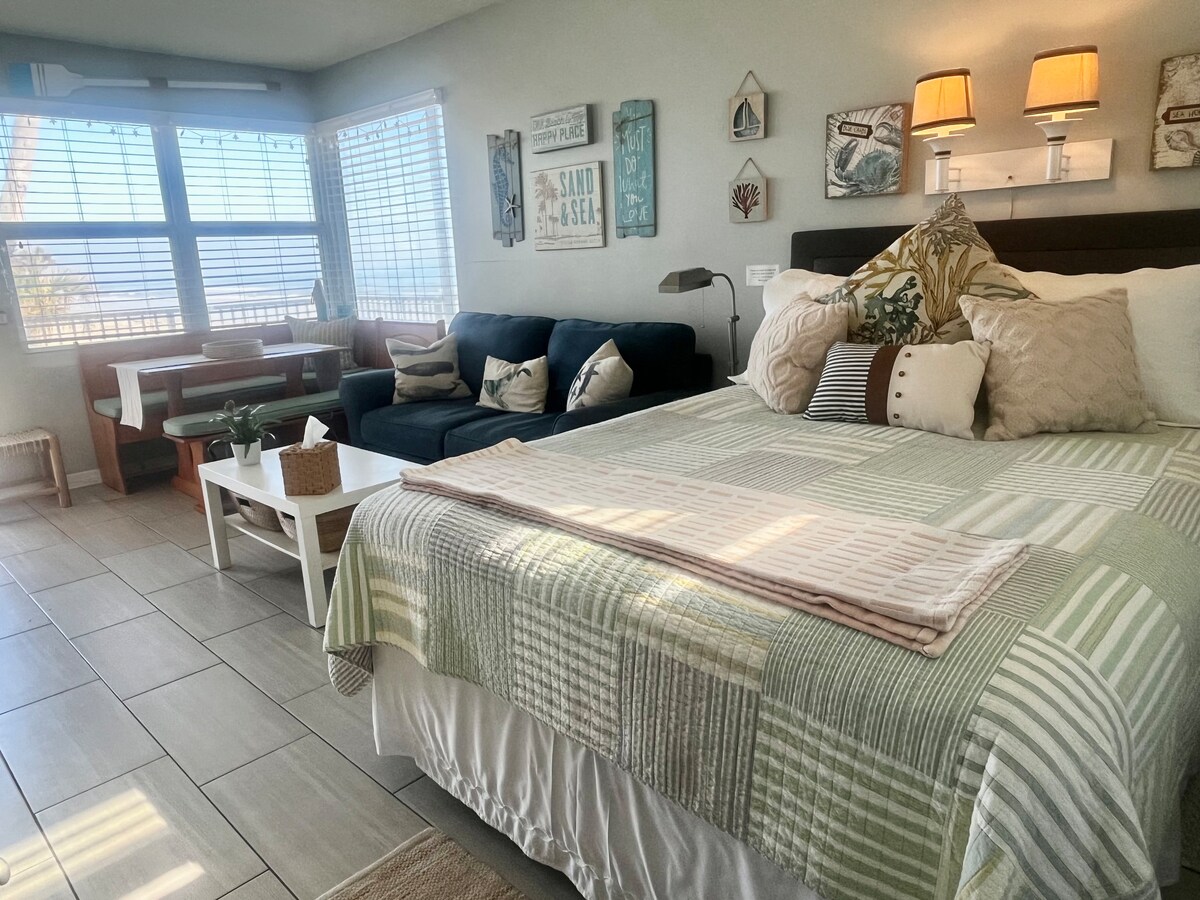 1BR direktno s pogledom na Dejtona Bič! Prozor balkona i dnevne sobe direktno okrenut prema plaži i bazenima. Direktan pristup plaži je preko severne strane zgrade u kojoj se nalazi parking, rampa i spoljni tuševi) Soba je na trećem spratu, 2 levo od lifta do sobe. ** Nova odjava od 12:00 umesto 11 za vašu udobnost! 2 bračna kreveta i kauč na razvlačenje - savršeno za porodični boravak u 🏖️☀️🌊