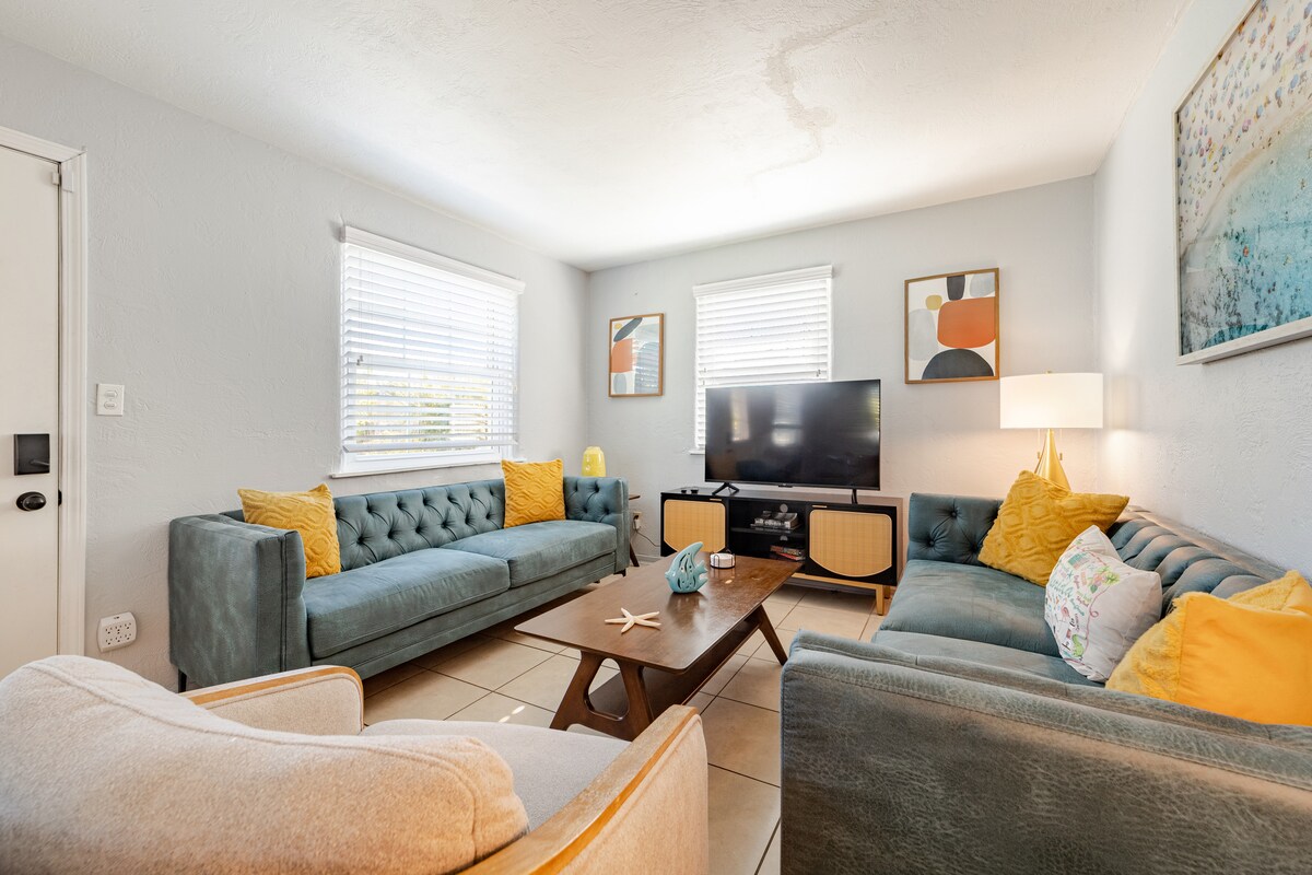 Plenty of parking for a trailer for Bike Week! We are OPEN to accepting pets but please message before booking to discuss. The front yard has been completely re-landscaped with loads of upgrades! Fully stocked 1950's Bungalow, 75" TV with lots of streaming options, & most importantly 1 block from the beach in the heart of Daytona Beach Shores. Walk out the front door and you're 100 yards from the waters edge and a 3 minute walk from your local Starbucks. It doesn't get any better than this.