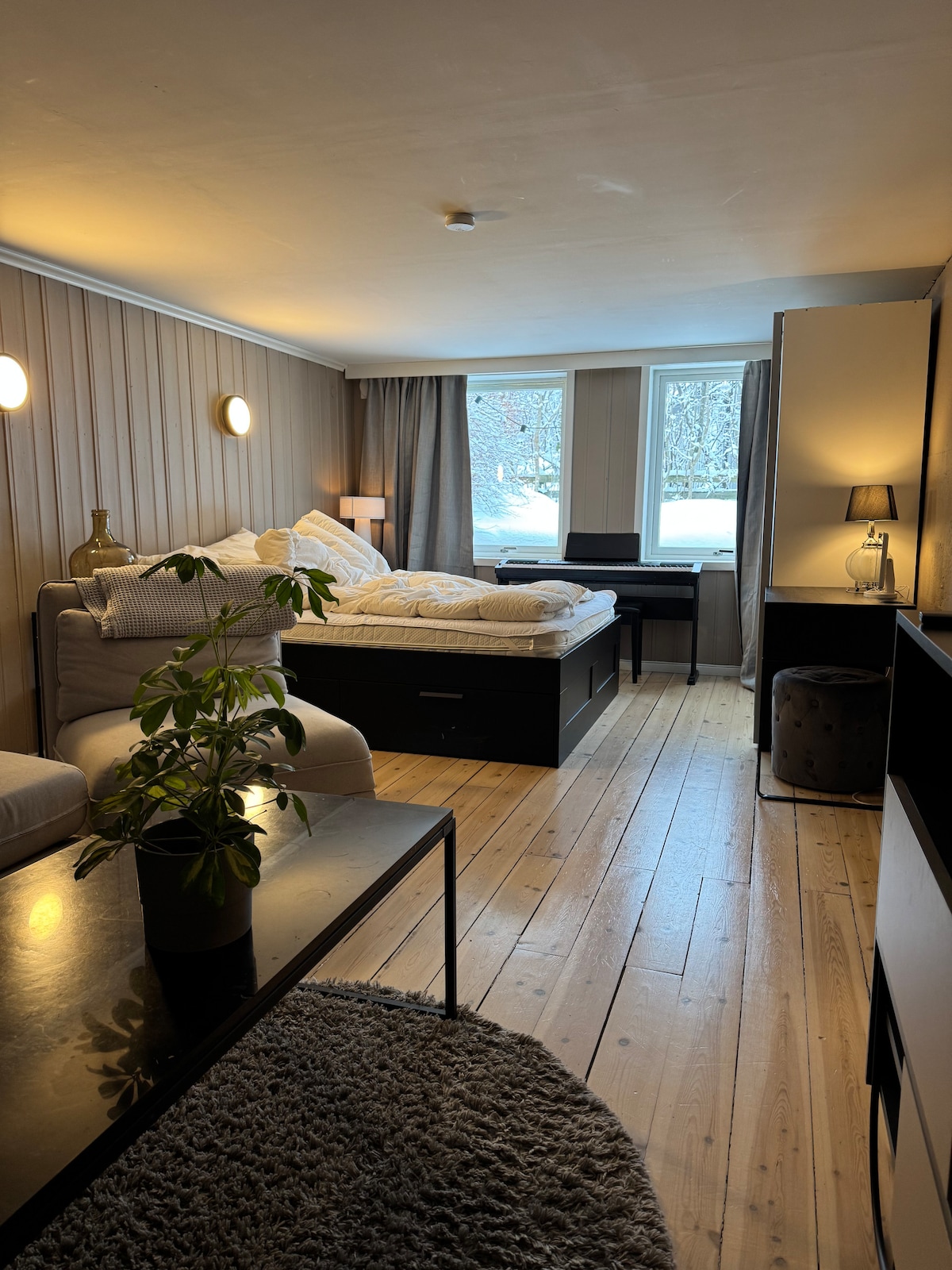 Sjednite se i opustite se u ovom mirnom i elegantnom smještaju. Kada uđete na vrata, bićete u dnevnoj sobi. Sa privatnim balkonom i kaminom. Sofa i bračni krevet. Idite stepenicama da biste došli do kuhinje i kupatila. Kuhinjski pult je prilično mali, ali ima indukcioni krov i rernu. Stan je pogodan za jednu do dve osobe koje žele da budu blizu terena za planinarenje i skijaških staza. Lepa polazna tačka za šetnje prirodom. Istovremeno, samo 30 minuta od centra grada Osla sa muzejima i restoranima.