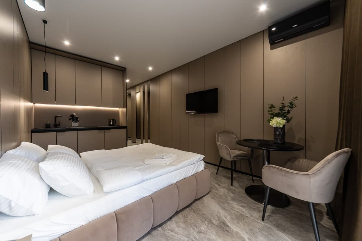 Nevjerovatan objekat koji se nalazi u centru Kijeva u butik hotelu. Renoviranje je završeno 2021. Samo nekoliko sadržaja koje treba navesti: plafoni od 4 metra, Smart TV sa YouTube-om i Netflix-om, tuš-kabina, izuzetno veliki prozori, veliki prilagođeni krevet i još mnogo toga. Oni koji traže luksuz u centru Kijeva ne mogu da pođu sa ovim objektom. Objekat ima recepciju koja se nalazi 24 sata u dvorištu.