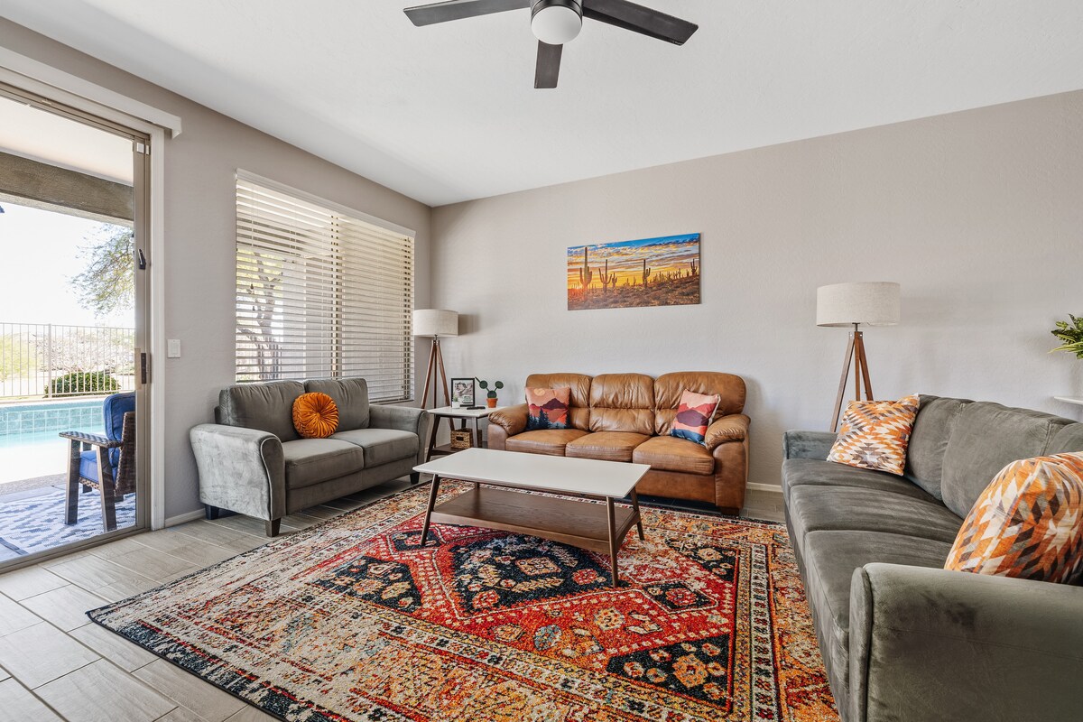 Dobro došli kući u svoj luksuzni smještaj. Savršeno za porodice i grupe porodica. Ovaj skoro novi dom sa 5 spavaćih soba i 3 kupatila ima 2 glavna apartmana. Izuzetno velika kuhinja sa skoro novim aparatima od nerđajućeg čelika. Predimenzionirana porodična soba sa TV-om od 70inča i prostorom za igre na sreću. Nalazi se u susedstvu preko puta parka. Blizina odličnih mjesta za planinarenje, nagrađivanih terena za golf i profesionalnih sportskih sadržaja, uključujući proljetni trening i NFL. Neka ovaj prostrani smještaj bude vaša baza za svaku avanturu u Arizoni.