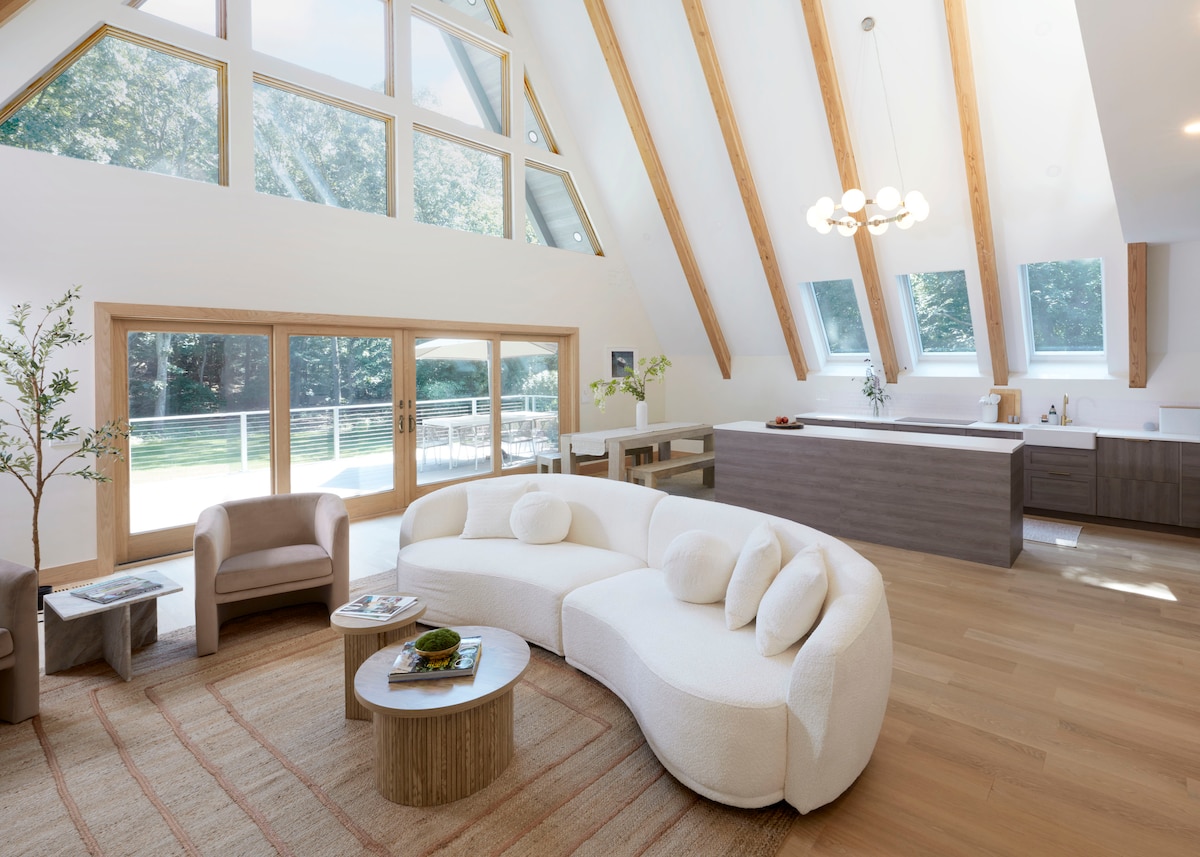 Escape to our Dwell Magazine-featured A-frame in the Hamptons! This stunning unique home is perfect for families or groups of up to 12. Enjoy a private pool, chef's kitchen, and designer details throughout. With 5 bedrooms, soaring ceilings, cozy fireplace, a large deck, private heated pool and lush yard, it's the ultimate luxury retreat for carefree beach days and creating lasting memories. Just minutes from the beach and local attractions, this properly is fully equipped for families & groups.