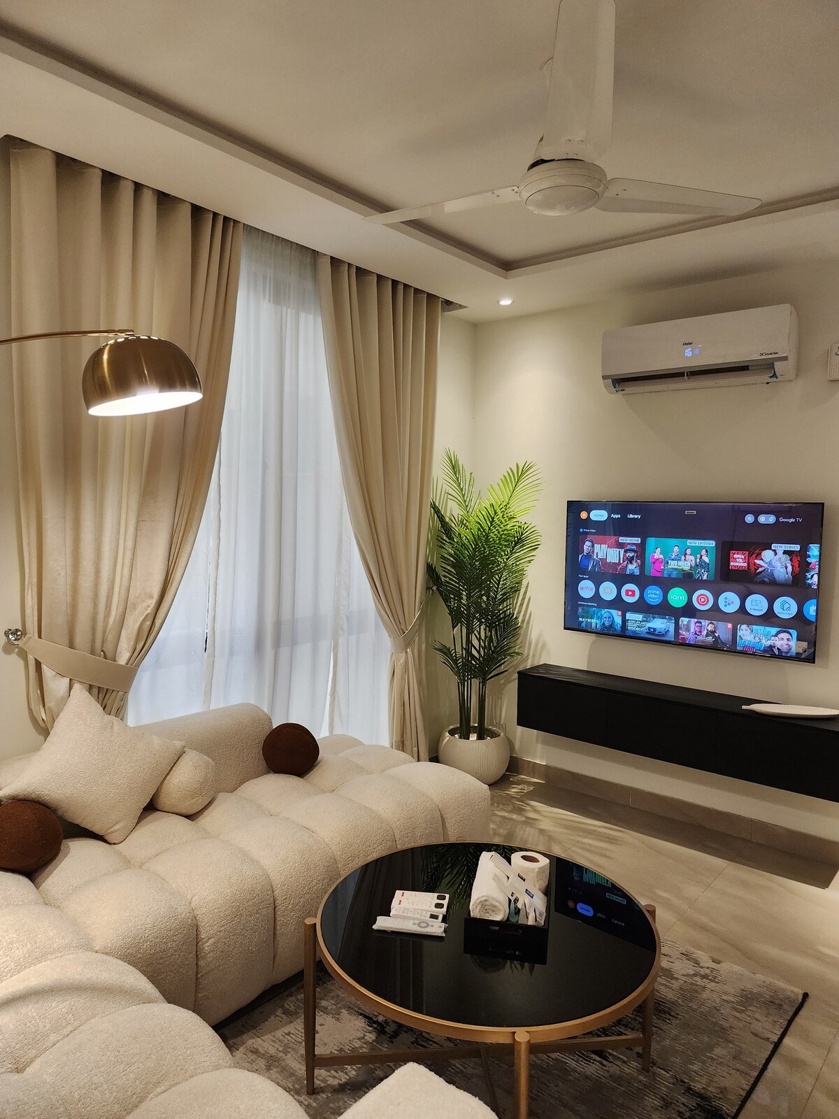 Doživite dizajnerski život u Luniq-u, samo nekoliko koraka od ulice MM Alam, u srcu Lahora, gdje su kafići, butici i noćni život. • 🛋️ Estetski salon sa udobnim tepisima, visećom lampom i zavjesama u punoj dužini • 🛏️ Plišani bračni krevet (king) sa vrhunskom posteljinom i pogledom na grad • Android Smart TV od 55 inča sa Netflix-om i YouTube Premium-om • 🍳 Potpuno opremljena moderna kuhinja sa osnovnim sadržajima • ⚡ Brzi Wi-Fi za posao ili strimovanje • 🔑 Jednostavna samostalna prijava za potpunu privatnost • 🌆 Odlična lokacija u Gulbergu