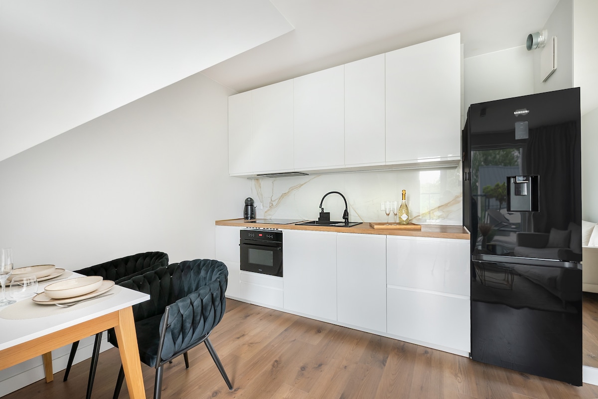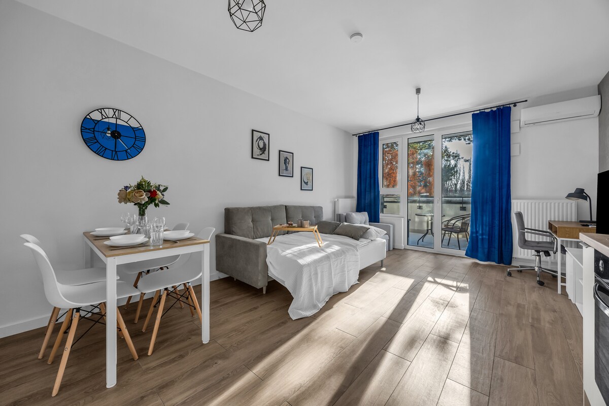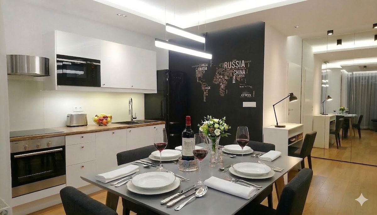 Moderan stan sa privatnom terasom i hidromasažnom kadom koja radi tokom cijele godine (do 104 °F/40 °C). 🫧 * Privatni đakuzi – primenjuje se dodatna naknada: 150 PLN (za iznajmljivanje do 3 noćenja) / 200 PLN (za iznajmljivanje 4 i više noćenja) po đakuziju. Moguće je iznajmiti objekat bez hidromasažne kade. * Terasa od 25 kvadratnih metara (82 kvadratna stope) * Teretana i sauna u zajedničkom prostoru * Smart TV 70" i PS4 * Besplatan parking u podzemnoj garaži * Potpuno opremljena kuhinja i snažan Wi-Fi Napomena: - Bez kućnih ljubimaca, pušenja u stanu i bez zabava.