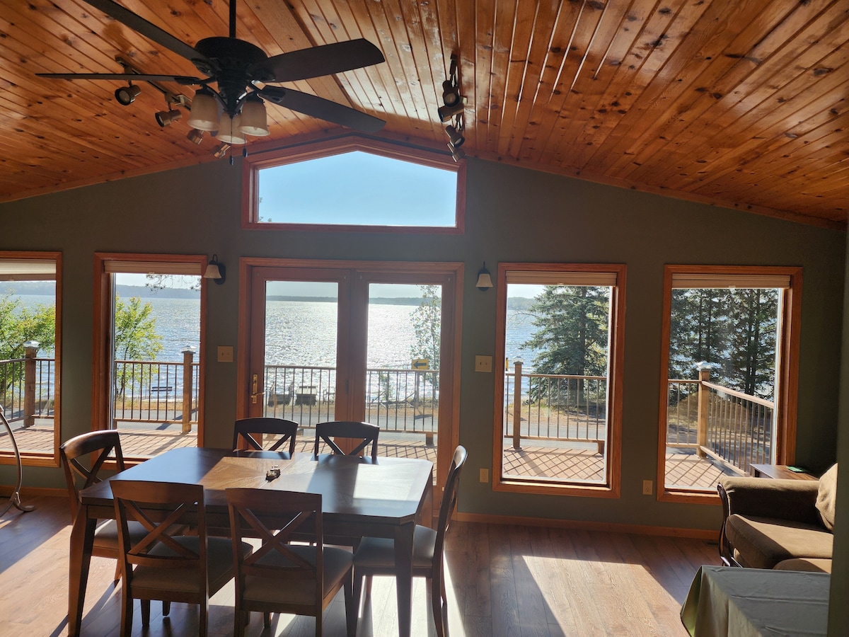 ZIMA: MINIMALNO 2 NOĆENJA LJETO (od JUNA do PRAZNIKA RADA minimalno 7 noćenja. Od subote do subote. Skrovita rustikalna brvnara na 18 hektara sa privatnom obalom jezera od 500 stopa. Zabava može da bude tokom cele godine. Uhvatite izlazak sunca s velikih prozora s pogledom na jezero, uživajte u planinarenju i hodanju po snijegu, aktivnostima na vodi u kojima može da uživa cijela porodica. 1 kanu, 2 kajaka i 1 daska za veslanje + ponton je dostupan za iznajmljivanje. Nalazi se u blizini staza za terenska vozila i motorne sanke. Jedan od naša dva smještaja vidi oazu za zalazak sunca.