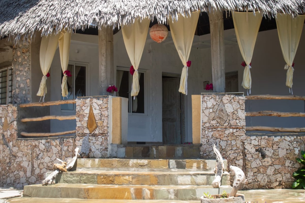Kuća u tradicionalnom svahilijskom stilu, nalazi se na koralnom rtu s pogledom na more, plažu, prelijepe vrtove u cvatu, privatni pristup plaži. Nedavno je postavljen bazen, POGLEDAJTE KUĆNI RED Vila ima 2 nivoa i pogled na Indijski okean, privatni direktan pristup plaži, koja se prostire sa obe strane, unutar morskog parka. Uključuje 3 člana osoblja, kuvara i dnevnu uslugu u sobi i baštovana. Može da spava do 10 osoba. Lako se prilagođava i čini udobnim za ugošćavanje manjih grupa, koristeći samo spavaće sobe na spratu.