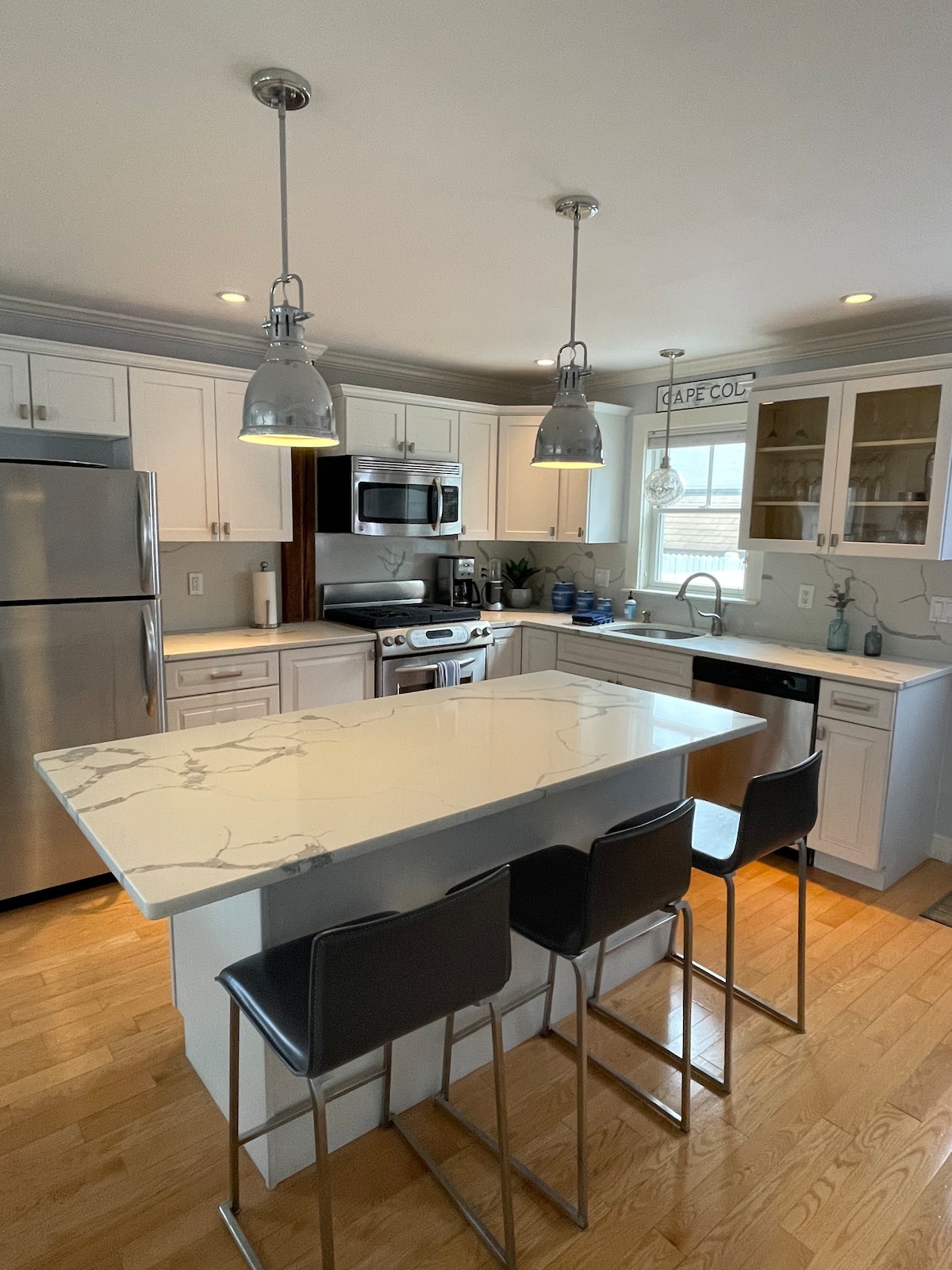 Predivno namješten,potpuno renoviran 3BD ,2BT dupleks na fantastičnoj lokaciji. Prostrano dvorište. Na kraju ćorsokaka. U roku od nekoliko minuta od plaža, staza, Great Pond i Wiley Park. Otvoreni životni prostor poziva na okupljanja porodice i prijatelja. Moderna kupatila, potpuno opremljena kuhinja sa novim aparatima. Odličan spoljni prostor, terasa, veliki stolovi,roštilj, mnoštvo parkinga, klima-uređaji, W/D. Spava do 6 osoba. Posteljina, peškiri, peškiri/stolice za plažu i suncobran. Mirno Kejp Kod dom