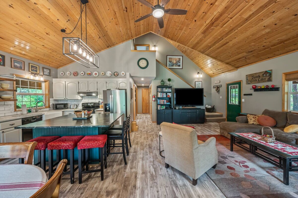 Svi koji uđu u brvnaru to apsolutno vole! Udoban i čist, odličan koncept sobe. Budite deo grupe dok pripremate obroke u kuhinji i velikom ostrvu sa prelepim kvarcem. Kuhinja je potpuno opremljena, uključujući kafu, čajeve, jednostavne predmete kao što su folija, kesice itd. Nijedan trošak nije bio pošteđen prilikom izgradnje ove veoma slatke brvnare. Vrata staje pokrivaju 2 spavaće sobe, kupatila imaju klizna džepna vrata. Mašina za pranje/sušenje veša za pranje/sušenje veša i podovi sa grejanjem u oba kupatila. Nadamo se da ćete uživati