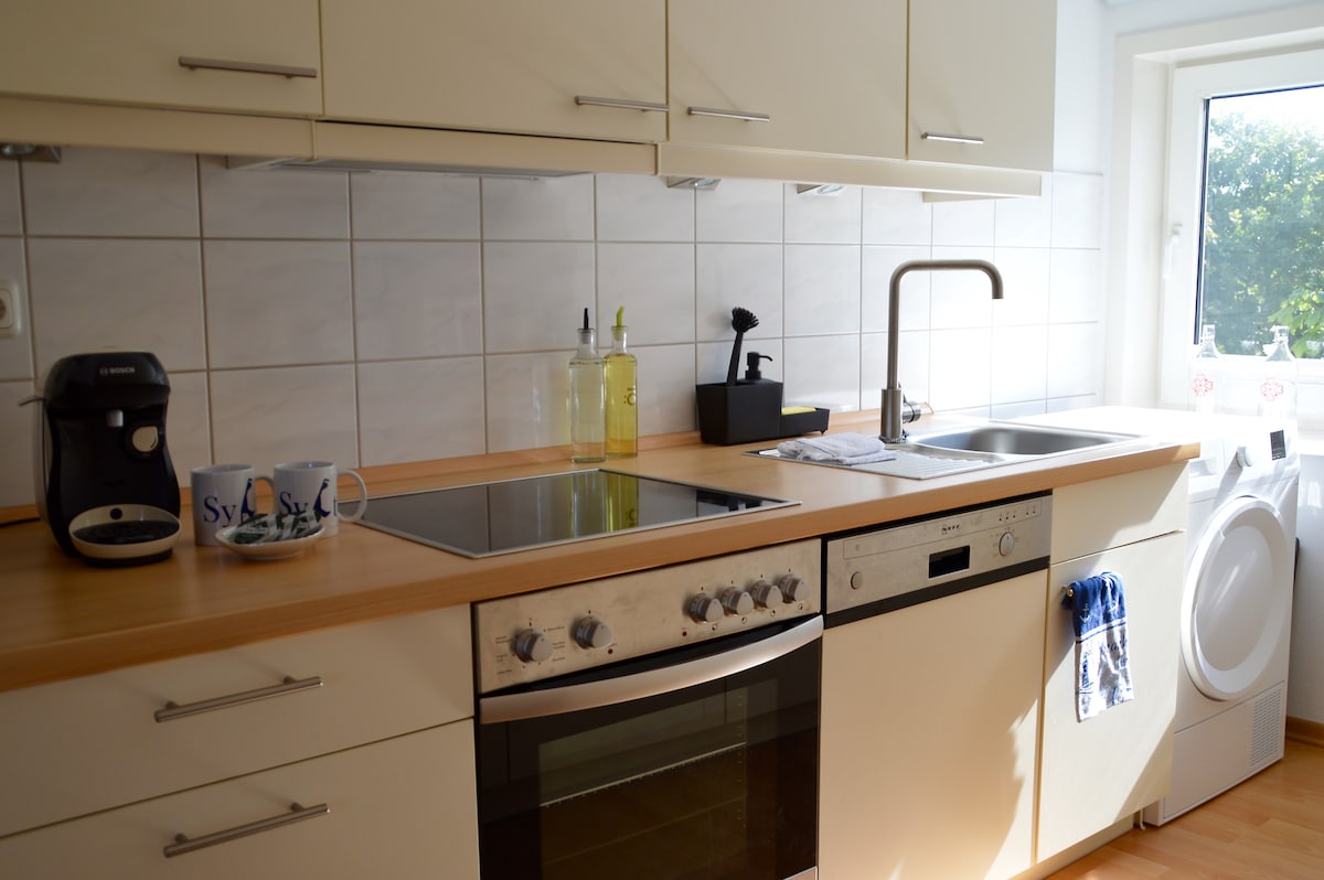 Svijetli, bijelo namješteni dvosobni stan na 2. spratu sa pravim drvenim parketom, potpuno opremljenom kuhinjom, kupatilom i spavaćom sobom. U srcu Venningtedta, u neposrednoj blizini seoskog jezera, mnoge prodavnice (pekare u prizemlju kuće) i odlični restorani. Gosch i plaža su u blizini! (5-10 minuta). Sa balkona sa stolicom za plažu možete vidjeti svjetionik Kampener. Autobuska stanica je odmah ispred vrata. Prijava je od 16:00.