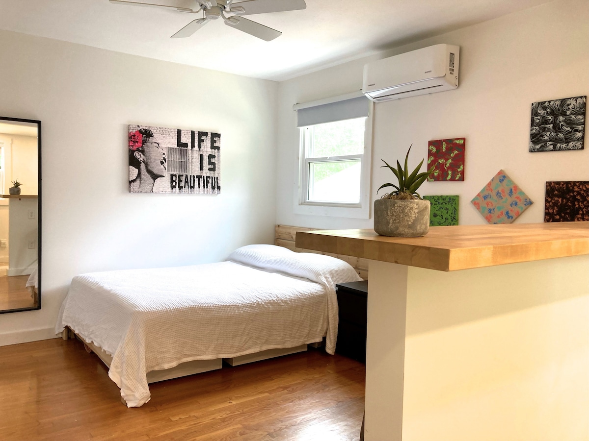 Uživajte u svom privatnom apartmanu u kojem su kućni ljubimci dobrodošli u srcu zapadnog Ešvila! Ovo udobno skrovište može udobno da ugosti 4 osobe i ima zaseban ulaz, privatnu natkrivenu verandu i čajnu kuhinju. Savršeno smješteni, udaljeni ste samo 10 minuta hoda od poznatih pivara i mjesta za branč u ulici Haywood Road, a kratkom vožnjom do centra grada i imanja Biltmore. Idealno za parove, male porodice i ljubitelje kućnih ljubimaca koji traže mirno utočište sa lakim pristupom svemu što Ešvil nudi. Šumovito zemljište za posmatranje ptica