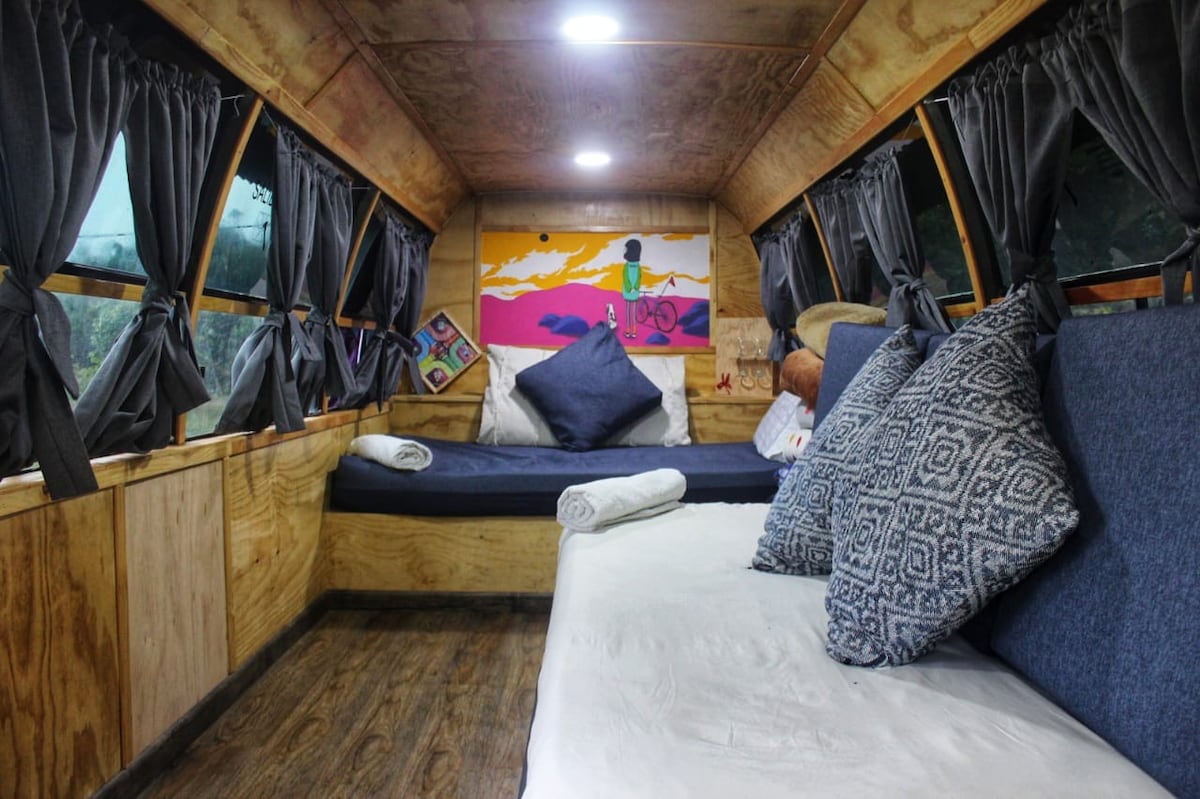 Nalazimo se u oblacima Koronada, u neposrednoj blizini San Hozea. To je jedinstveni smeštaj, autobus pretvoren u prelepu mini kuću, usred planine. Imamo bračni krevet, dve fotelje koje se pretvaraju u bračne krevete, potpuno opremljenu kuhinju, terasu sa pogledom na planinu i roštilj usred bašte. I prostor za logorsku vatru. Pored toga, naši gosti mogu da koriste sve sadržaje na ranču Samaná.