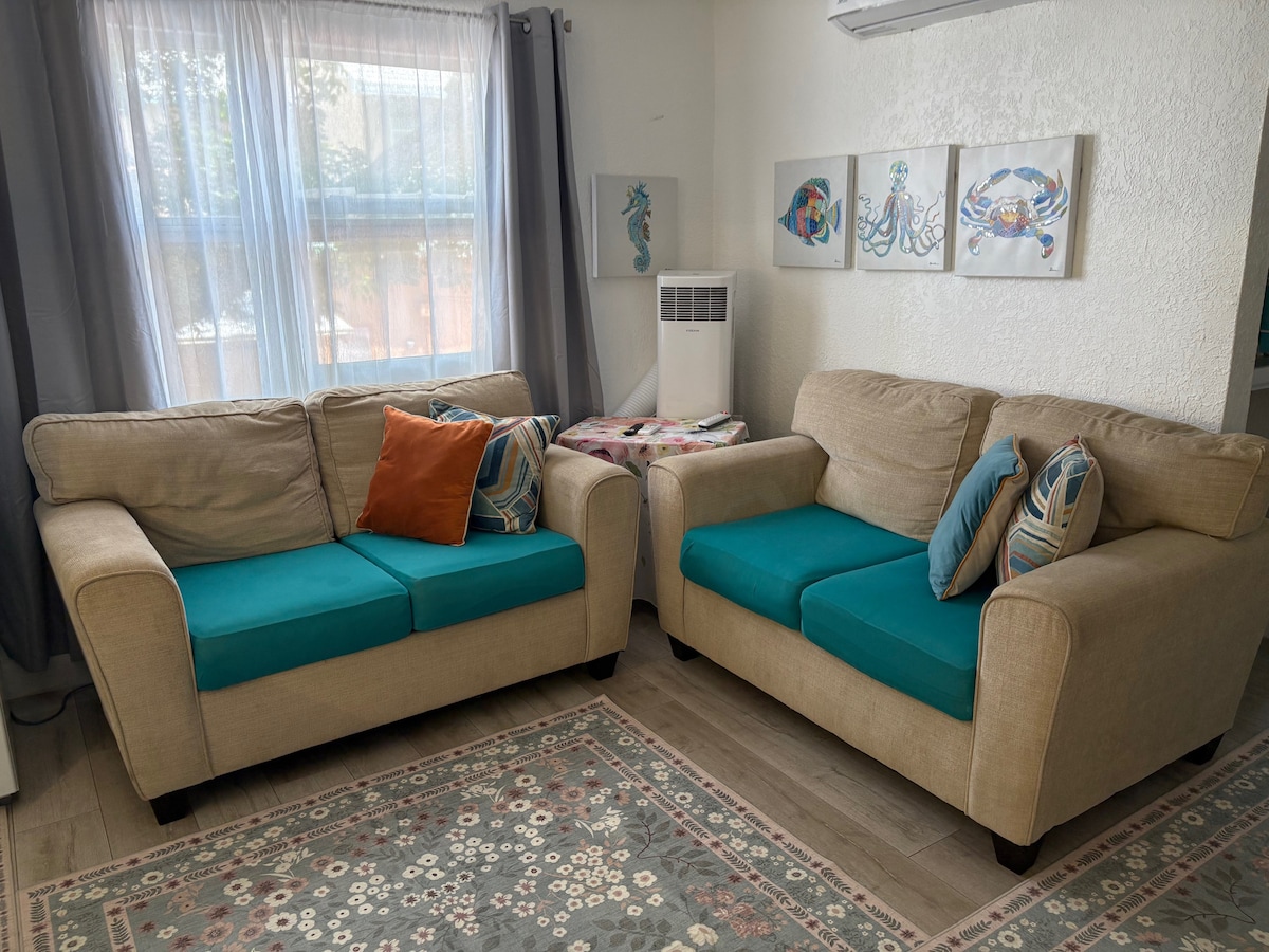 Great location , parking at driveway next to enter . EV(non Tesla ) fast charger . Fenced side walk backyard/patio . Spacious private studio on a main floor,on back of 2 story house . Spacious updated shower ,vanity with double sinks .Contactless check in/check out .In a room Quinn side bed, couch , TV, washer/dryer,pool table , fridge, kitchenette inside and outside fully equipped and furnished.very private .PBI airport ,free parking beaches , restaurants, shopping plaza from 5-15 minute away.