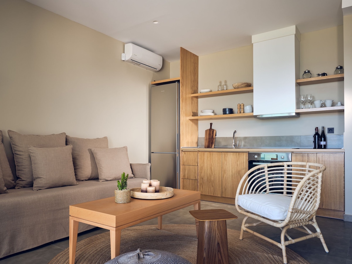 In the heart of a peaceful town at your doorstep you will find restaurants, shops as well as famous Skala beach. Features free wifi, AC, kitchenette, fridge, TV, comfortable bedding in modern and warm atmosphere, can accommodate up to 3 adults. Car is not needed as everything is within walk-able distance.
