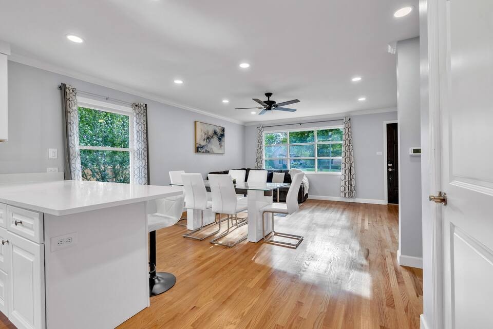 This home features a spacious living area, fully equipped kitchen, three bedrooms with comfortable beds. A lower level rec room with cozy sofa and a pool table Conveniently located near the airport, you can easily travel to & from your flights. Explore nearby attractions, restaurants, shops, or take a short drive into the vibrant city of Chicago If you're looking for a quiet retreat or exciting urban adventure, this lovely home is the perfect choice for your stay.