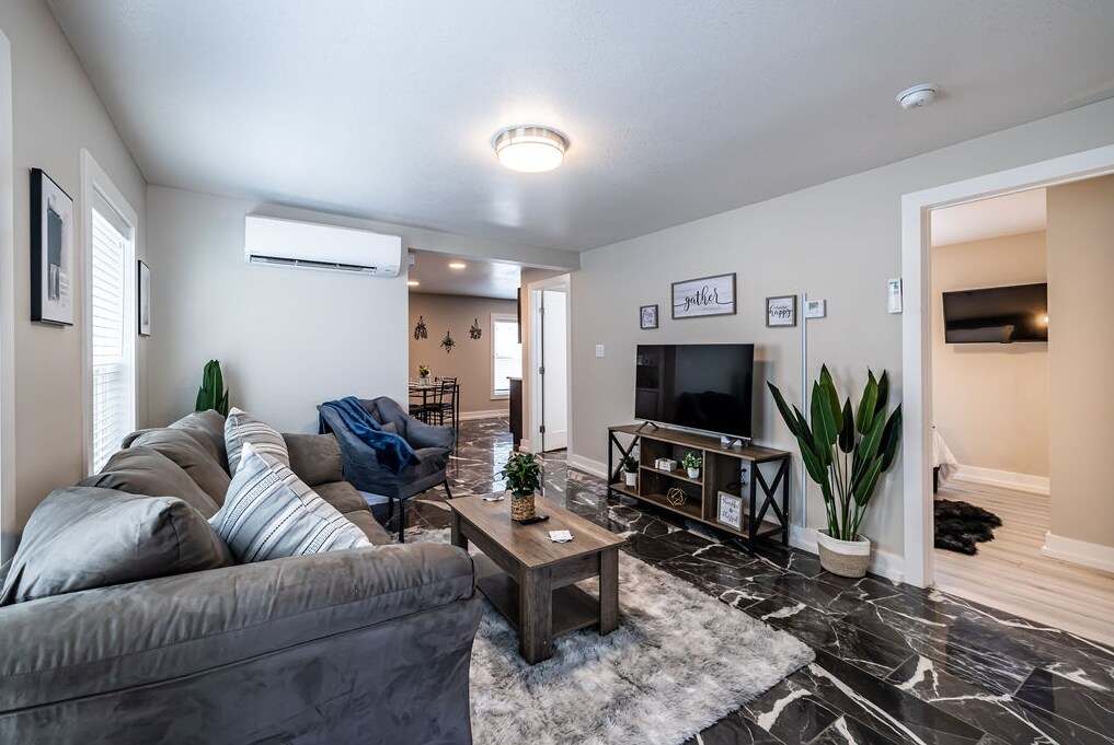 Our 3 bedroom house is completely renovated with a brand new kitchen and updated bathroom. Relax and watch TV on the 86 inch flatscreen. The home is centrally located in a family friendly neighborhood, minutes away from the amphitheater, downtown and hospitals. Conveniently located beside the town’s best market with fresh coffee, groceries, hot foods with the best wings in town! Your stay here will put you around the corner from Fairmount Shopping Center. Washer/dryer in house!