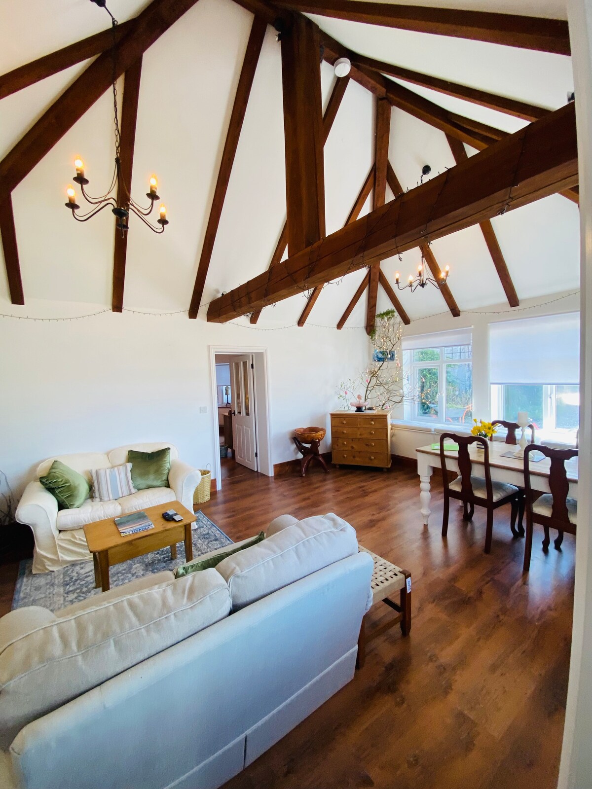 Prostrana samostalna seoska kuća sa tri kreveta sa svetlim i prozračnim prostorom za spavanje i stambenim prostorom koji su pripojeni kao deo naše kuće iz 16. veka. Imaćete svoju privatnu baštu, smeštenu na 30 hektara sa vrtovima, parkovima i šumama. Spektakularne šetnje i obala u blizini, sa seoskom kućom na reci u gradu i pabovima i restoranima u okolini. Dostupna je dodatna jedna spavaća soba (za spavanje 2), kao i pansion sa doručkom: obratite se domaćinu za detalje. + 20 £ jedna popusta na naknadu po psu.