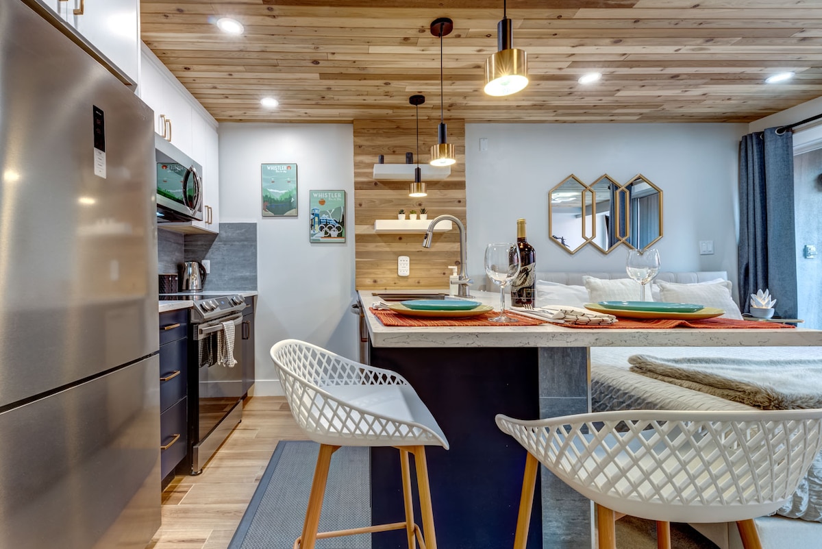 Udobno planinsko utočište inspirisano sredinom veka u Vistleru (pre nove ere). POGODNOSTI LOKACIJE: ◦ 3 min. hoda od nove gondole ◦ 5 minuta vožnje do Vistler Vilidža ◦ Koraci od nekih od najboljih prodavnica/restorana u Vistleru ◦ Jednostavan pristup autoputu POGODNOSTI PROSTORA: ◦ Moderan, udoban, moderan enterijer iz sredine veka ◦ Luksuzni jorgan i jastuci ◦ Električni kamin ◦ Visokokvalitetni namještaj u novouređenom prostoru ◦ Jedinstveni starinski delovi u celom prostoru ◦ Gramofon ◦ Mnogo prirodnog svjetla