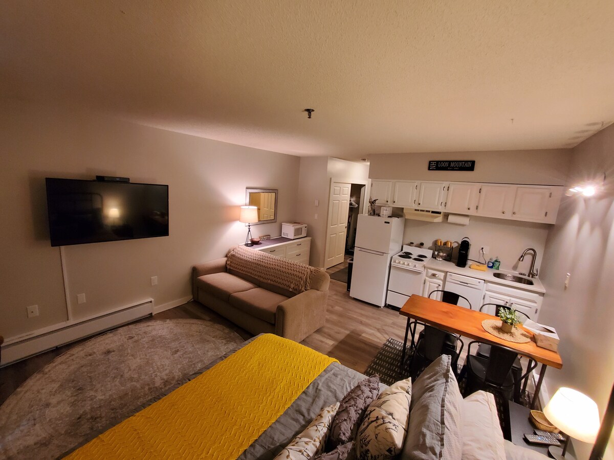 Udoban studio apartman u hotelskom odmaralištu za 3 osobe. Smešten u podnožju južnog vrha Loon Mauntina, u predivnim Belim planinama Nju Hempšira. Uživajte u predivnom pogledu na planinu i reku Pemi! Svideće vam se priroda, planinarenje i divan planinski pejzaž! Odlična trpezarija i aktivnosti na otvorenom. Zatvoreni bazen i đakuzi su otvoreni i nalaze se u našem objektu. Odlični restorani u neposrednoj blizini. Besplatan prevoz autobusom do Loon Lift kapije. Reka Pemigewasset je pozadi.