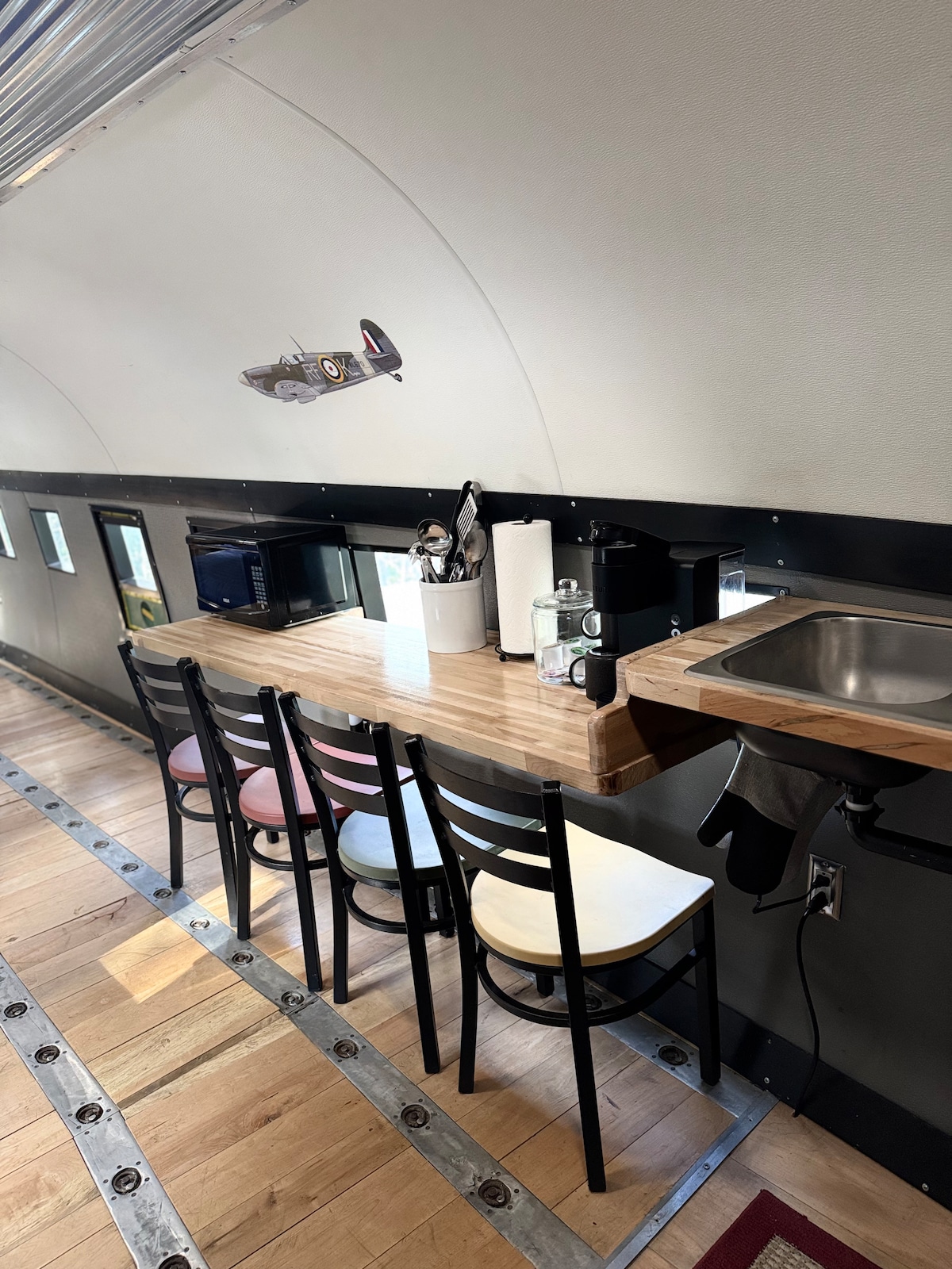 1941. godine Daglas DC-3 Airliner iz Drugog svetskog rata. Plutali su ga američki marinci za vojne usluge prevoza između Guama, Midveja i Perl Harbora. Retrofit za udobnost preko noći sa klima-uređajem, grejanjem, kupatilom, tuš kabinom, kuhinjom sa spoljnom terasom i prostorom za roštiljanje i logorskom jamom koja se nalazi među drvećem pored privatnog jezera sa pristaništem. Udobno spava četiri osobe. Sedite u potpuno restauriranom, osvetljenom kokpitu i osetite kako je bilo letjeti jednim od najpoznatijih aviona ikada izgrađenih!