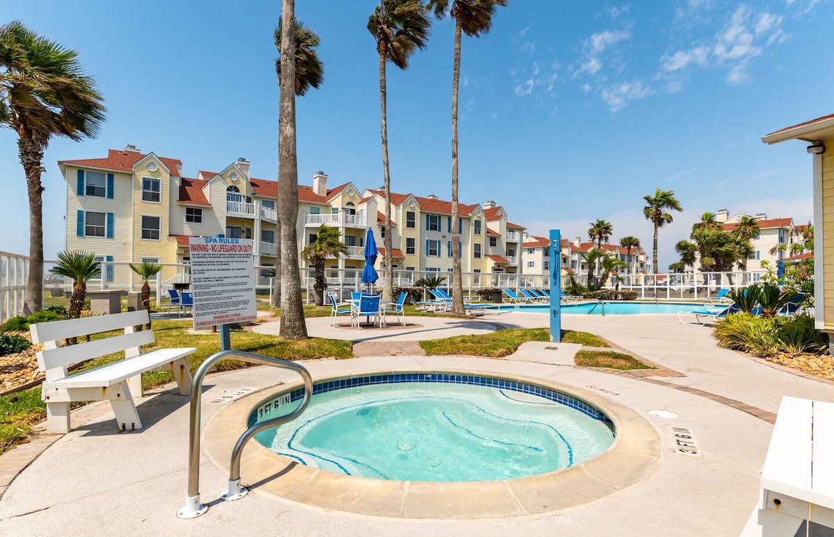 Velika, moderna kuća u nizu sa 1 spavaćom sobom/1 kupatilom, za najviše 4 odrasle osobe i 2 dece, na N. Padre Isl. u blizini kanala Packery. Kratka šetnja do plaže. 3 grijana bazena, igralište, roštilji i 2 parking mesta. Terasa. Unutra: 2 pametna televizora sa Netflix-om, mašina za pranje/sušenje veša, kuhinja sa posuđem, šerpama i tiganjima, aparat za kafu, blender, čajnik, toster, mikrotalasna, mašina za sudove, šporet, šporet. Spavaća soba ima bračni krevet. Bračni krevet na sprat u hodniku. Tu je i kauč za spavanje. Brava bez ključa. STR#202088
