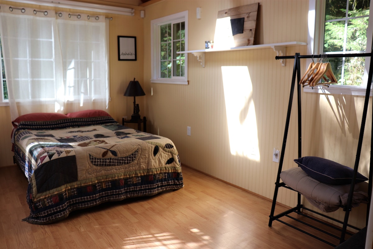 Upravo renoviran za prostranost od 400 kvadratnih stopa , sa dva gravitaciona naslonjača i udobnim bračnim krevetom, privatnim kupatilom i laganim prostorom za jelo. Nalazimo se na punoj površini od pola hektara. Živimo u glavnoj kući, a studio je ispred naše kuće, a ne na okeanskoj strani, pogled na okean se može vidjeti sa kuhinjskog prozora , postoji privatno dvorište koje vas vodi do okeana. Nemojte ponijeti uređaje za kuvanje jer to nije dozvoljeno. Utikač 110 je tu za punjače za električna vozila.