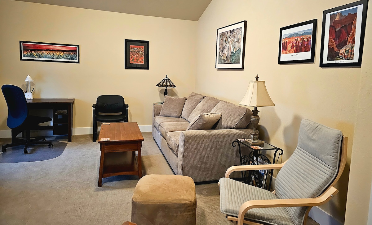 Mirna, udobna spavaća soba sa privatnim kupatilom u istorijskom okrugu Corvallis 's College Hill West. Samo nekoliko minuta (pešačenje, vožnja biciklom ili vožnja) od kampusa OSU-a, prodavnica, pabova i restorana; jednostavan pristup kilometrima planinarenja i vožnje biciklom u šumi Corvallis Greenbelt i osu 's McDonald' s Forest. Uživajte u doručku u sunčanom kuhinjskom kutku ili (leti) na terasi ili prostranom dvorištu. Wi-Fi je dobar za rad na daljinu - ili se samo opustite se i opustite se. Klavir u dnevnoj sobi takođe prihvata vašu upotrebu!