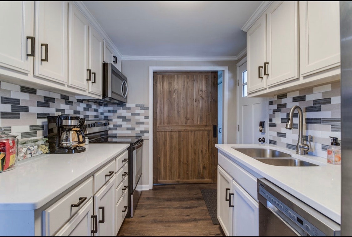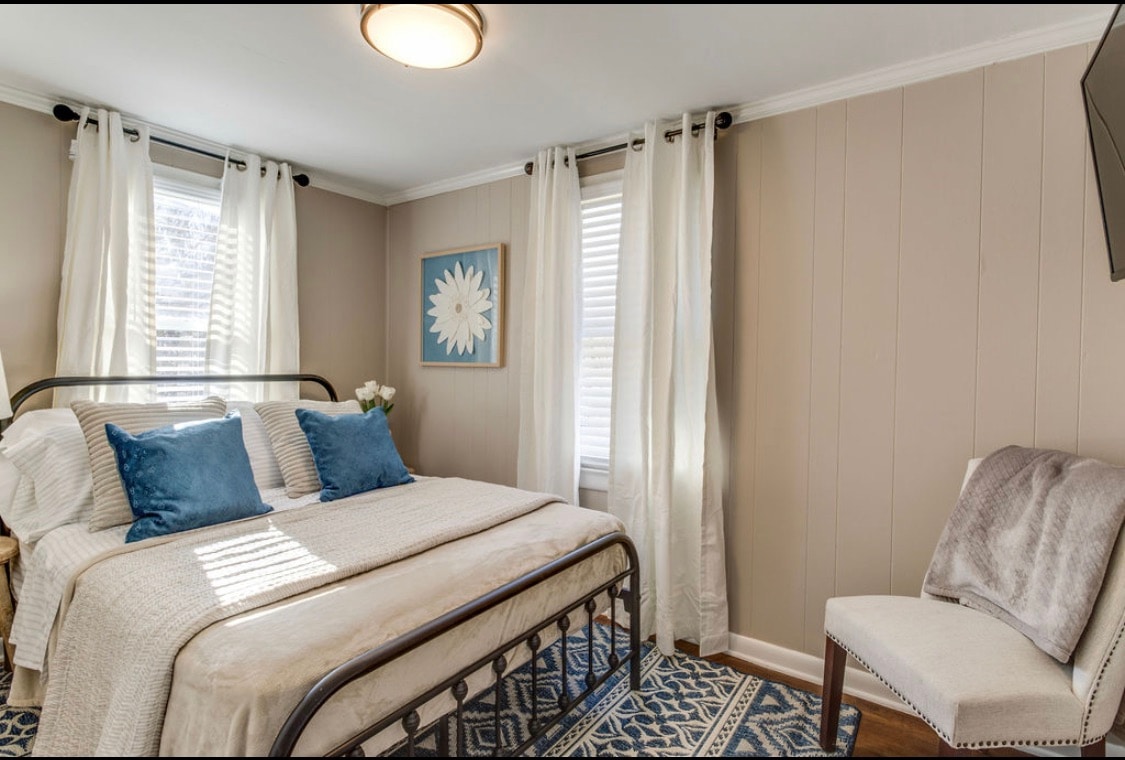Prostran dom, sa novim udobnim krevetima i svježom posteljinom. Glavna spavaća soba sa sopstvenim kupatilom, 5 ravnih ekrana, brzi Wi-Fi, Hulu TV, Bose mini zvučnik, FP, potpuno opremljena kuhinja sa posuđem Caraway, aparatom za vafle i organskim kapsulama za kafu. Roštiljajte i uživajte na našem predivnom zadnjem trijemu s ljuljaškom u stilu američkog Juga, udobnim sjedećim garniturom i stolom za ručavanje. Objesite pored ognjišta na stolicama Adirondack. Deca vole ljuljašku od gume i ograđeni dvorište. 1 milja do prodavnica i restorana. Odličan prostor za porodična ili poslovna putovanja. Posvećeni smo izvrsnosti!