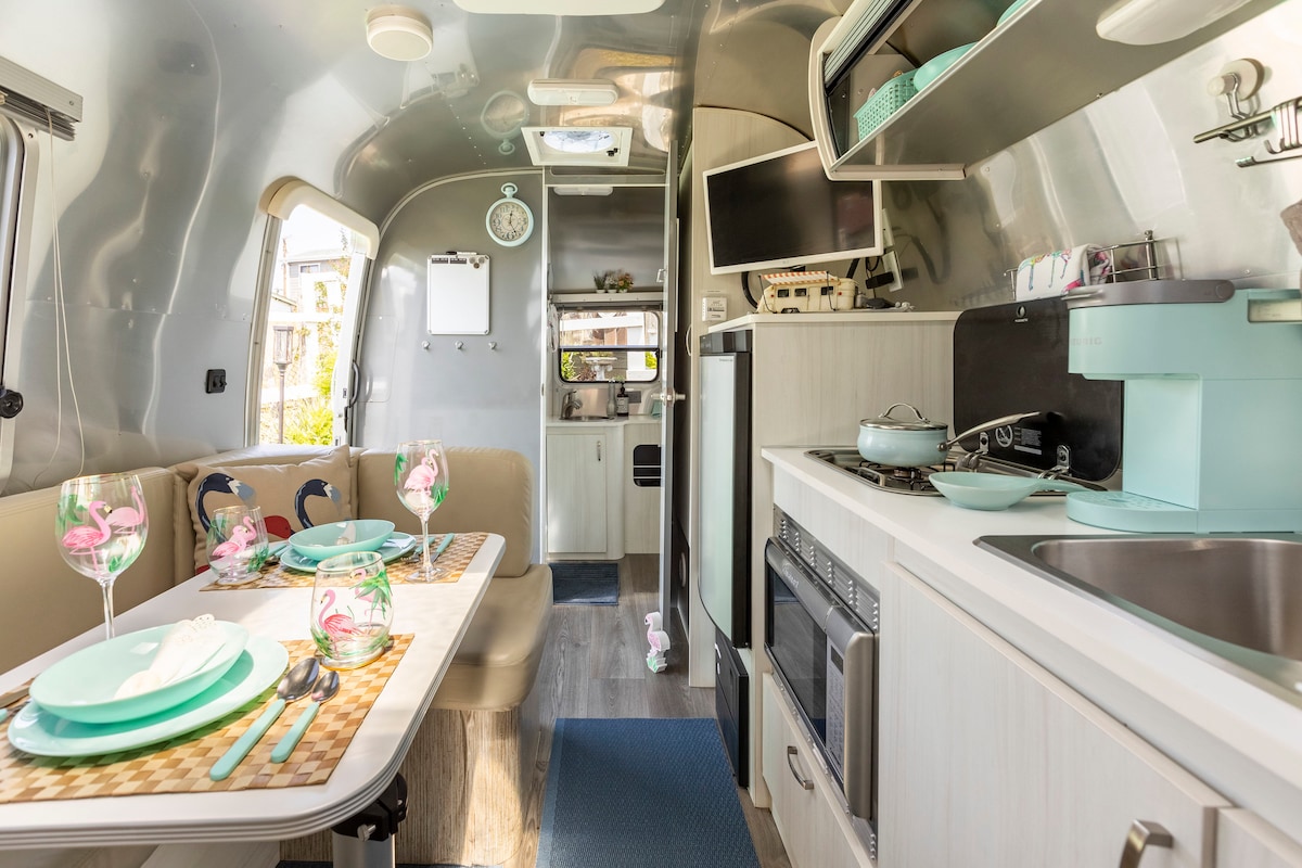 Jedinstven AirBNB doživljaj. Opustite se u legendarnoj prikolici Airstream 22'sa potpuno opremljenom kuhinjom, blagovaonicom, zasebnim kupatilom, zasebnom tuš kabinom, bračnim krevetom. Pametni TV od 25inča, kao i DVD plejer i radio zvučni sistem. Obezbjeđujemo pribor za jelo, tanjire, kuhinjsko posuđe, utencils, lonac, tiganj, jedan obrok Kerig, toster...većinu svega što vam je potrebno da se osjećate kao kod kuće. Opustite se i spavajte na jednom od najudobnijih dušeka. Probudite se do širokog pogleda na zaliv i gradski horizont.
