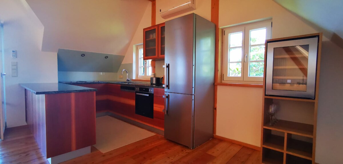 Proverite početnu stranicu: apartman-suedsteiermark. Stan se sastoji od velikog dnevnog boravka sa isključivo opremljenom kuhinjom i frižiderom za vino i otvorenim kaminom. 2 piste sa 7 m2 i balkonom na zapadnoj strani. Jedan od dva Wittmann kauča u dnevnoj sobi može da se izvuče u bračni krevet. Kupatilo je opremljeno tušem i mašinom za pranje veša ili zidnim radijatorom, a druga ima kombinovani tuš i WC šolju. Takođe je WC u stanu... podno grejanje i klima-uređaj....