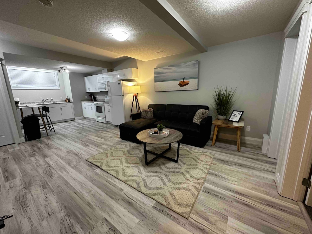 Dobro došli u ovaj novouređeni apartman. Ovaj apartman je veoma prostran sa otvorenom dnevnom sobom, kuhinjom, trpezarijom i glavnom spavaćom sobom!! Smešten u Timberlea sa 1 minut hoda do autobuske stanice, nekoliko minuta do pešačkih staza, i kratka vožnja do prodavnica. Potpuno odvojena jedinica od gornjeg sprata bez vrata koja povezuju prostore. Ovaj udoban apartman uključuje kompletnu kuhinju, TV od 55i 65inča, uključujući Netflix, Disney+ i Prime, 1 bračni krevet i 1 bračni krevet, ormar, kupatilo, vešeraj i internet.