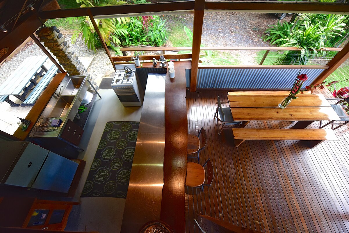 Jedina kuća u Daintreeu smještena u prašumi, iznad stalnog potoka, s vlastitom privatnom bazenom i slapovima. Kuća otvorenog tlocrta i velike verande pružaju panoramski pogled. Ovaj ekološki sertifikovani objekat koji se nalazi u centru grada savršeno je okruženje za romantičan odmor ili zabavno mjesto za uživanje porodice i prijatelja. Ako tražite mir i spokoj u srcu prašume, nećete želeti da odete. Idealno za ljubitelje prirode, posmatrače ptica i naturiste.