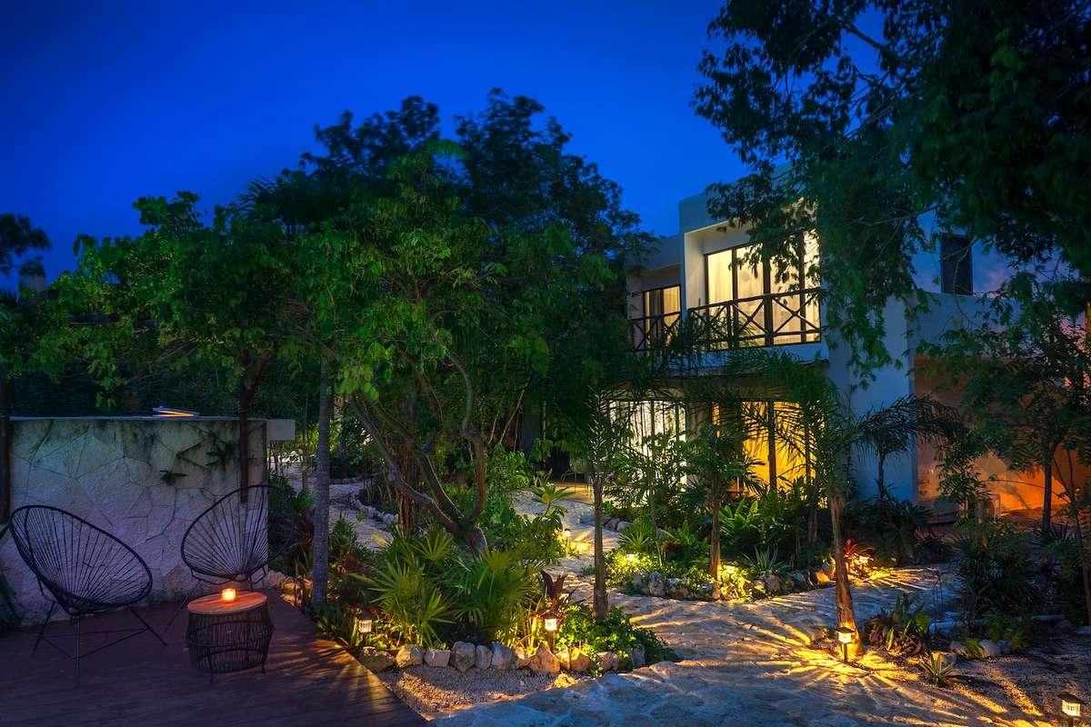 Naš dom je oaza u džungli od jednog hektara sa pet kreveta/2 kupatila i pet kreveta/1 kupatila. Arnah, udaljen je 20 minuta od Playa del Carmen i 20 minuta od Tuluma i samo 5 minuta od spektakularne plaže Akumal. Uživajte u cenotnom obliku bazena, roštilju, ležaljkama za sunčanje, besplatnom parkingu, jakom klima-uređaju, Wi-Fi mreži (50 Mb/s), potpuno opremljenoj kuhinji. nalazi se u prizemlju sa mnogo prirodnog svetla i direktnim pristupom bazenu.
