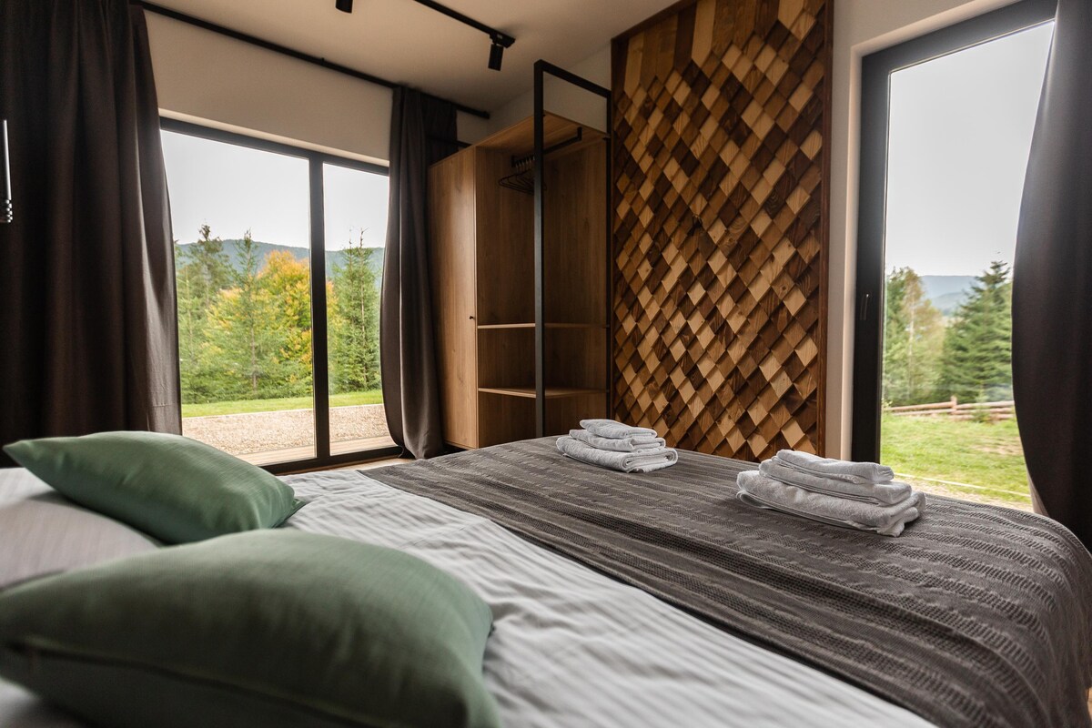Nezaboravno mjesto smješteno među karpatske planine i u blizini šume. Kuća ima dvije spavaće sobe sa velikim krevetima, potpuno opremljenu kuhinju sa modernim aparatima, udoban dnevni boravak sa pogledom na planine i kamin u kojem možete provesti prijatno veče. Kuća ima terasu sa namještajem za opuštanje i roštilj. Kuća ima kupatilo, tuš, mašinu za veš. Uz velike prozore, možete uživati u prelijepom karpatskom pejzažu direktno iz svog doma.