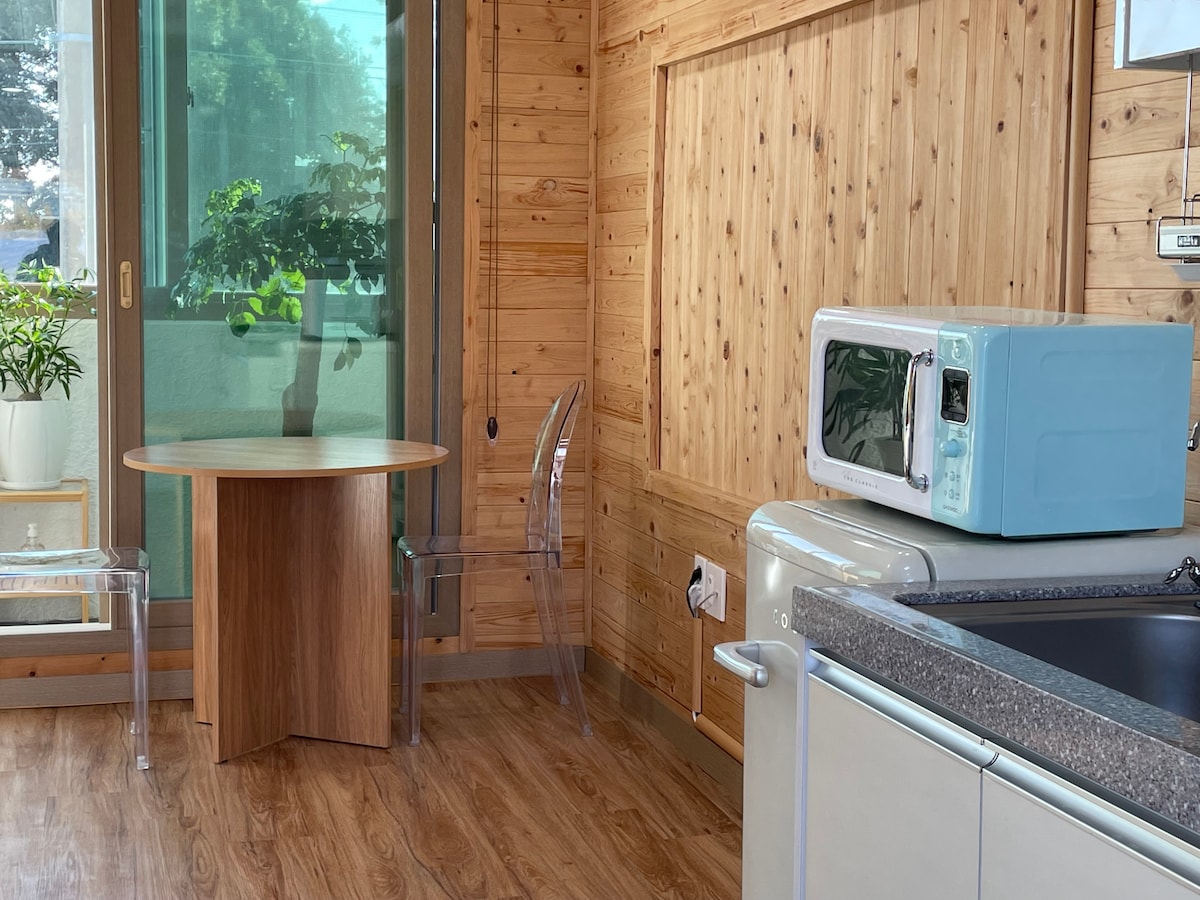 Ovo je čist i miran smeštaj koji se nalazi u Taeheung-ri, Namwon-eup, Seogwipo-si. To je aneks povezan sa glavnom kućom u kojoj živimo i nezavisan je prostor. Plafon je visok, tako da nije zagušljiv. Možete da vidite sunce danju i zvezdano noćno nebo noću. Ispred i pozadi je veliki prozor, pa je prijatno videti pejzaž iza kuće, gde su sunčano dvorište i nebo puni. U dvorištu i skladištu, koja je radionica za obradu drveta, tu je velika žvakaća mačka, Hobie, koja živi tamo. Ako volite ljude, ali im prvo ne prilazite, ali mrzite mačke ili ih se plašite, može da bude neprijatno. Možete otići do Saryeoni Forest Road i Red Oreum Natural Recreation Forest za oko 5 minuta automobilom do Namwon centra grada i obale gdje se okupljaju razni restorani, Hanaro Mart i prodavnice, 20 minuta do Seogwipa i 15 minuta. Potrebno je oko sat vremena da stignete do aerodroma. Potrebno je oko 15 minuta hoda do autobuske stanice, a možete da putujete autobusom koji prolazi kroz Ilju Road, ali je nezgodno putovati bez automobila. (Parking - U dvorištu je parking)