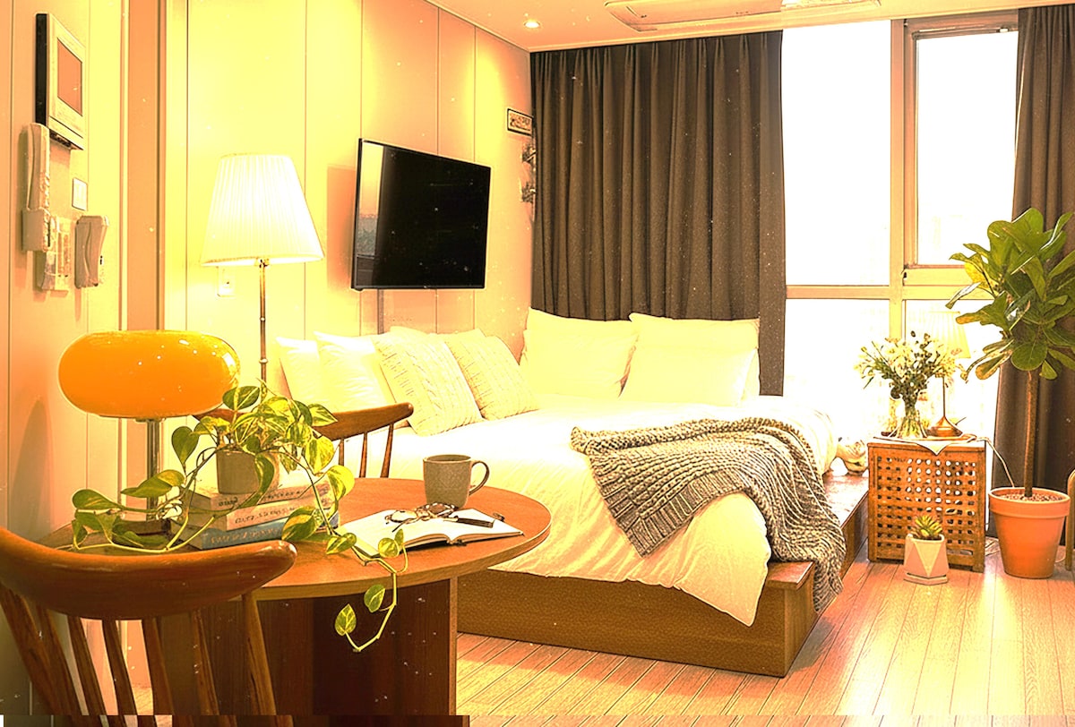 🌅Dan izlaska sunca je prijatno utočište sa pogledom na okean, starinskim drvenim enterijerom i gramofonom za tople analogne trenutke. Smješteni u Jeongjongdu, plaža, restorani i prodavnice udaljeni su samo 5 minuta hoda. Ostrvo Mulčido nalazi se direktno ispred i nudi zadivljujući pogled na more. Blizu smo i aerodroma Inčeon, savršenog za putnike. Domaćin lično pere i pegla svu posteljinu, osiguravajući izuzetnu čistoću. Uživajte u mirnom odmoru i uživajte u predivnom izlasku sunca pored mora.