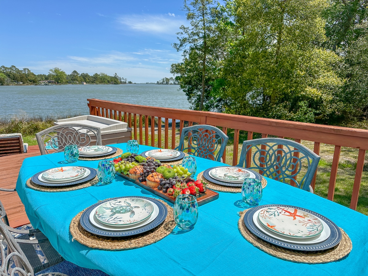 Prostrana kuća uz obalu s 5 spavaćih soba, privatnim pristaništem, pristaništem i zadivljujućim izlascima I zalascima sunca! Savršeno za grupna okupljanja i mirna utočišta, sa sobom za bilijar, pozorišnom sobom, više televizora i eklektičnom mješavinom DVD-ova, igara i knjiga. Napolju uživajte u terasi, travnjaku, kajacima, kukuruzu, klopkama za rakove, ognjištu i još mnogo toga. Ponesite čamac ili ribu sa mola. Predivne plaže su udaljene svega nekoliko minuta!