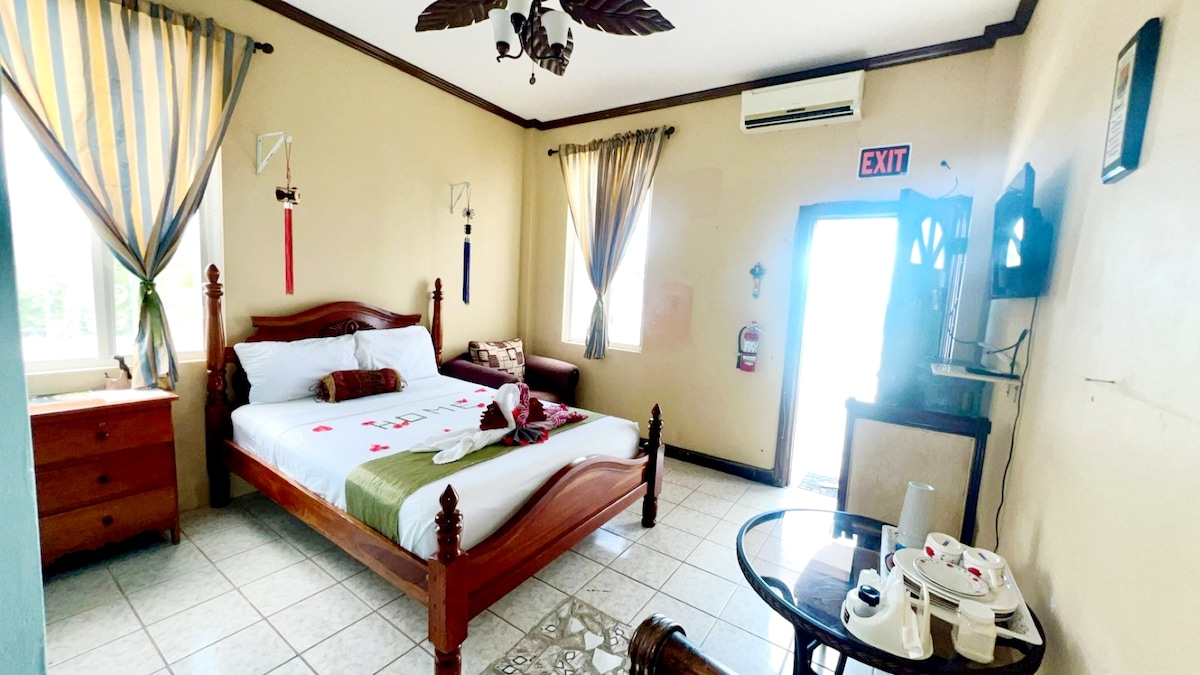 Opustite se u ovom studiju na drugom spratu sa balkonom dimenzija 3,65 x 6,4 m i pogledom na more, koji ima klima-uređaj, bračni krevet (širine 150–179 cm), ormar, pametni TV, mini-frižider, mikrotalasnu pećnicu, aparat za kafu, trpezarijski set, posuđe, ventilator, kadu, Wi-Fi i pristup našem BAZENU dimenzija 12,2 x 4,9 m, TERASI IZNAD VODE I BARU U SKLOPU OBJEKTA. Nalazi se na 0,4 milje/9 minuta hoda od RESTORANA i KAZINA, 0,7 milja od PRODAVNICE i 5 milja od AERODROMA i centra Belize Sitija. NAPICI na popustu. Dostava hrane, prevoz od/do aerodroma, OBILASCI I TAKSI USLUGE su dostupni *PRISTUP ZAJEDNIČKOJ KUHINJI ZA BORAVKE DUŽE OD 3 DANA