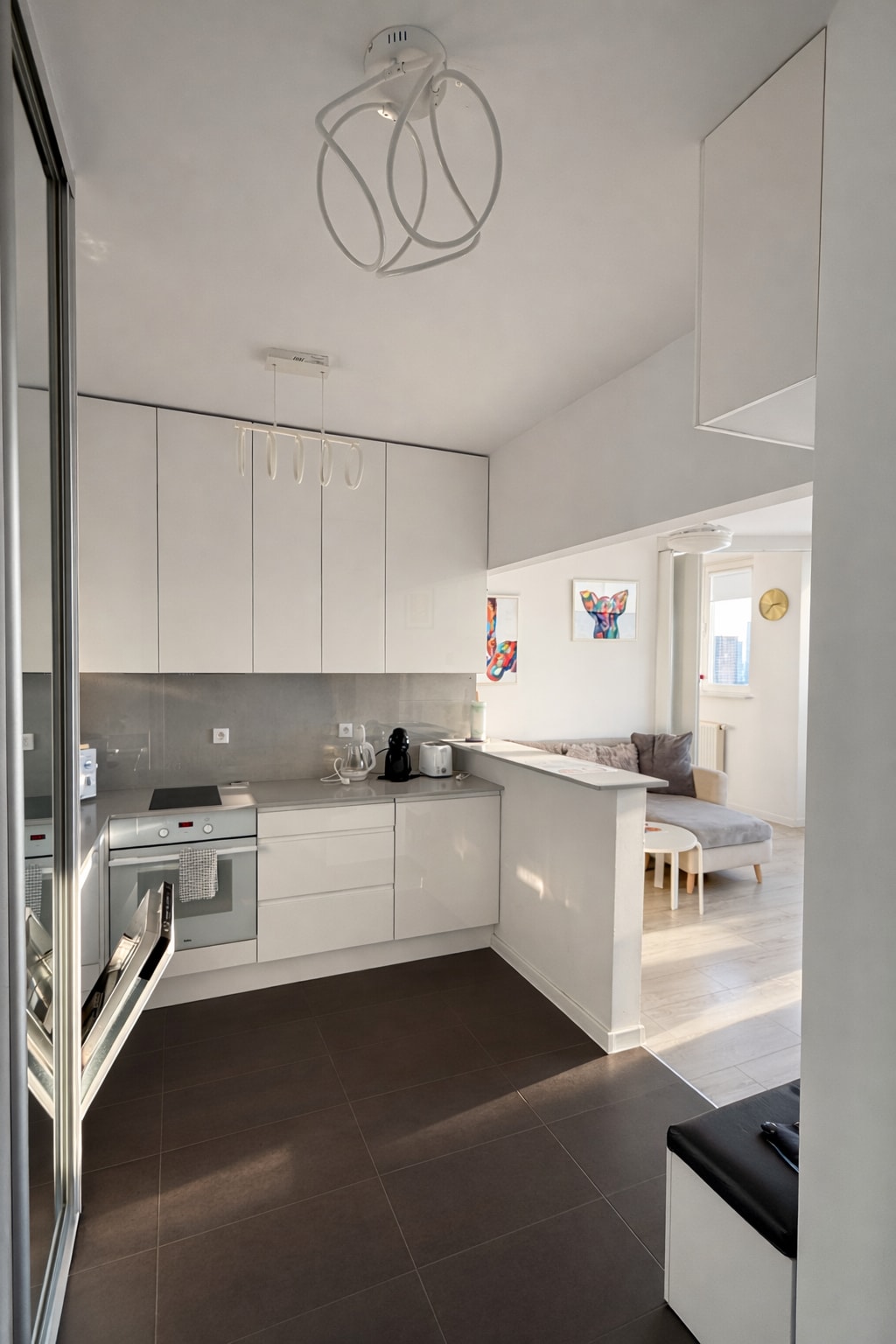 Udoban, potpuno opremljen stan u novoj zgradi. Dnevni boravak sa otvorenom kuhinjom podeljen na trpezariju i prostor za sedenje. Spavaća soba ima veliki krevet i prostranu garderobu. Postoji i ormar kao dodatni prostor za odlaganje. U blizini ima prodavnica, restorana i kafića Oprema: klima-uređaj, aparat za espreso, kuvalo za vodu, pegla, daska za peglanje, veš mašina Dolazak sa aerodroma Šopen 20 min. taksi 50 min. komunikacija od aerodroma Modlin 50 minuta taksijem 120 min komunikacija