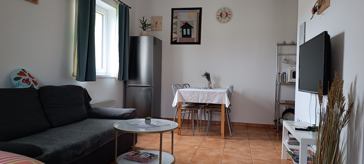 Tento klidný nově postavený moderní apartmán je koncipovaný jako 1+kk. Celý prostor je vzdušný a příjemně moderně zařízený. V obytné místnosti se nachází manželská postel, šatní skříň, společenské a jídelní sezení. Kuchyňský kout je plně vybaven. Další prostory pro spaní je umístěno v otevřeném patře pod střechou přístupné po dřevěném schodišti. Všechny matrace jsou pohodlné a zdravotní. Z apartmánu je přímý vstup na terasu, ze které je překrásný výhled na zámek Hluboká nad Vltavou.