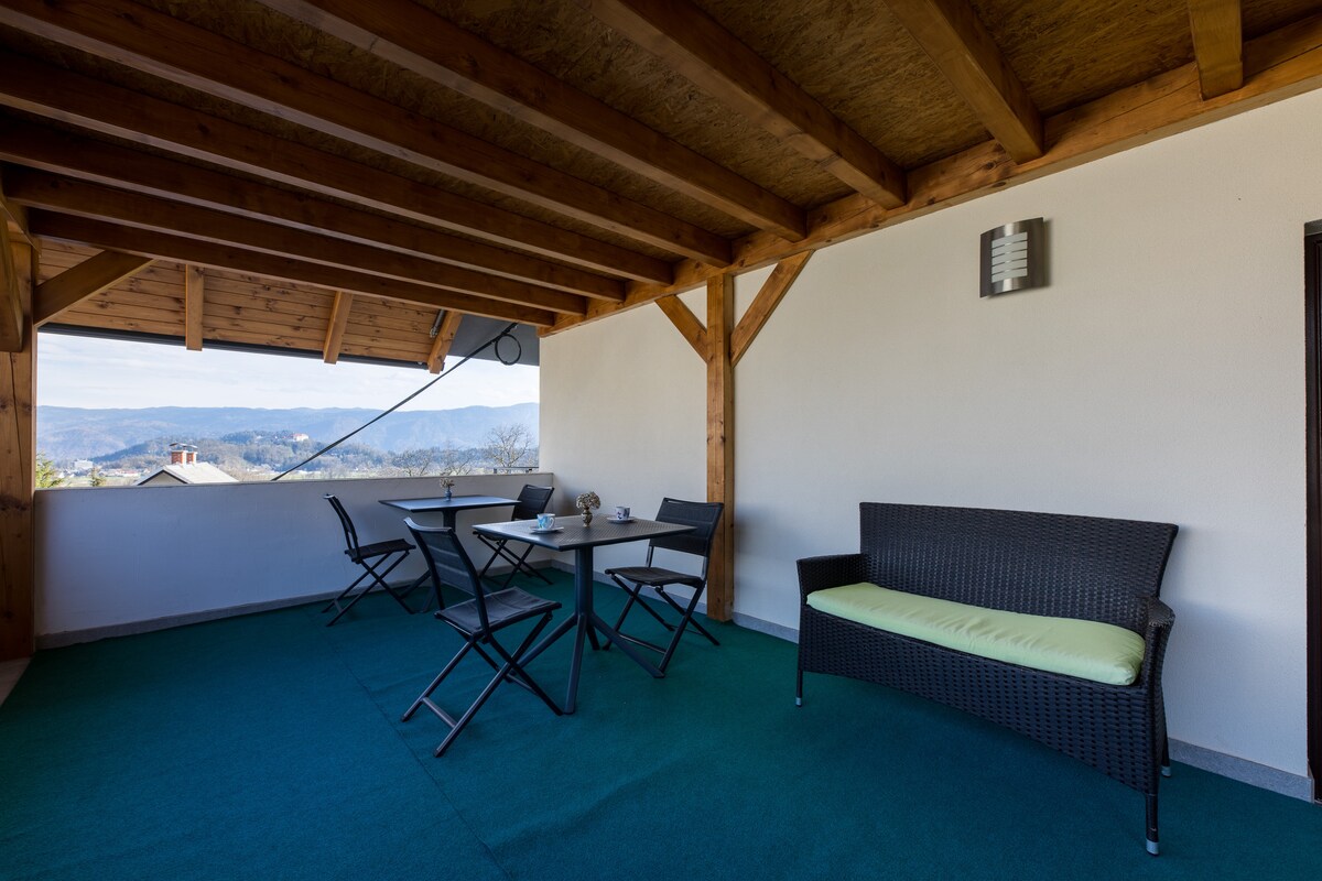 Naš dvosobni stan sa 1 kupatilom, kuhinjom, spacius dnevnim boravkom sa kaučem i trpezarijskim stolom, klima-uređajem i terasom spacius nalazi se samo oko 100 metara od Bledskog jezera (kupalište). Nalazi se u vrlo mirnom području. Ima sopstveni ulaz i nalazi se u našoj kući (tako da smo uvijek u blizini da vam pomognemo). Mi smo petočlana porodica i rado ćemo vas ugostiti. Održivost: Proizvodimo više energije nego što koristimo. Turistička taksa (3,13 za odrasle dnevno, 1,56 za djecu stariju od 7 godina) nije uključena.