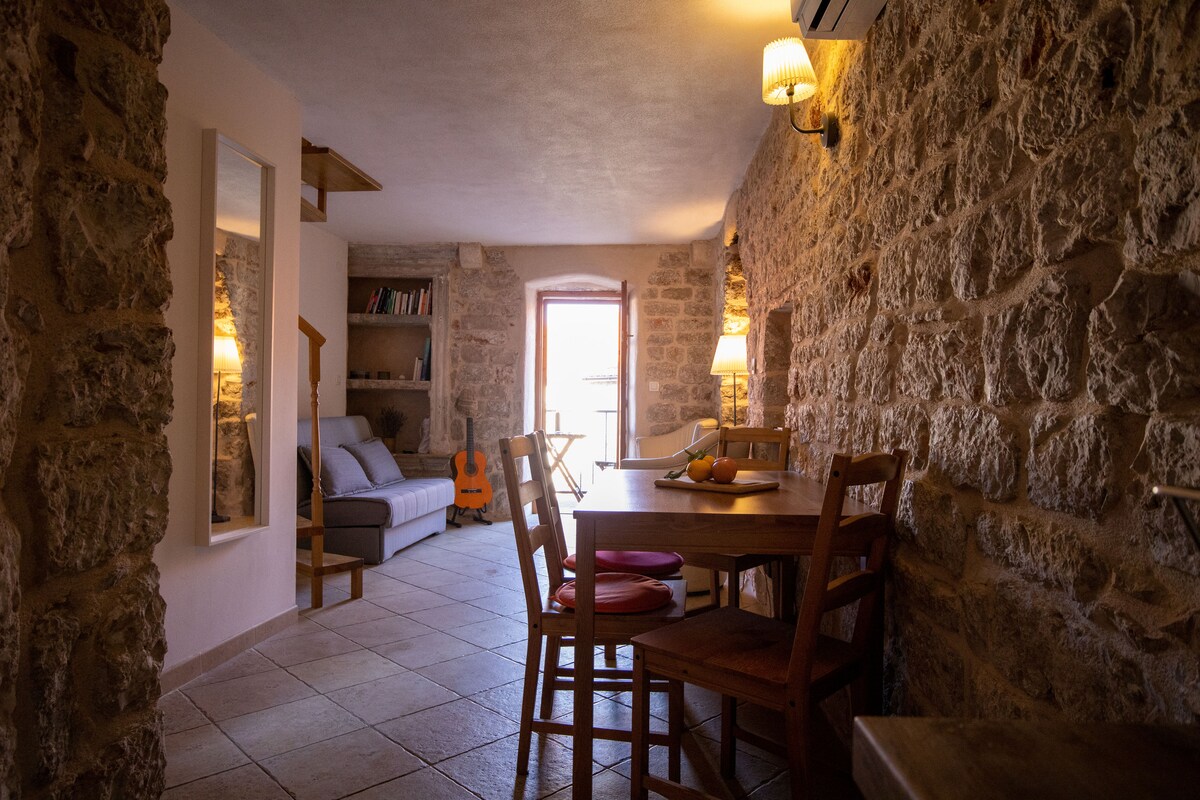 Kamena kuća na dva sprata, sa spavaćom sobom, dnevnim boravkom, trpezarijom, kupatilom i kuhinjom. Sagrađena je 1711. godine, u centru Jelse. Ima sve moderne sadržaje: klima-uređaj, TV, mašinu za pranje veša, opremljenu kuhinju i kupatilo i malu biblioteku. Takođe, naši gosti dobijaju bocu domaćeg vina i maslinovog ulja. Udaljen je najviše 100 metara od mora. Mala terasa s pogledom na našu baštu savršena je za uživanje u kafi ili čaši vina.