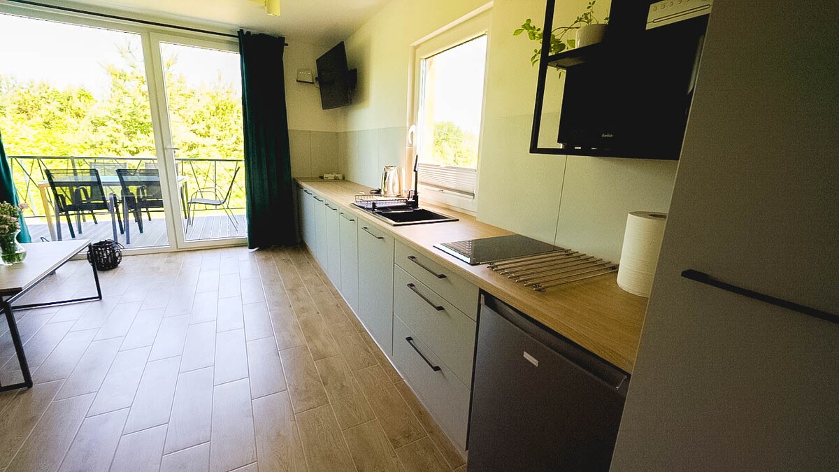 Udoban i moderan (završen 2019. godine) apartman za 2 do 4 osobe koji se nalazi na poslednjem spratu pansiona, koji je deo velikog (36 ha) privatnog bivšeg mlinarskog naselja „Tenderowizna”, smeštenog u Jurskom pejzažnom parku. Površina apartmana je 50m2, uključujući spavaću sobu, otvoreni prostor sa potpuno opremljenom kuhinjom, trpezarijom i dnevnim boravkom sa kaučem na razvlačenje (za 2 osobe), kupatilo sa toaletom i tušem. Wi-Fi. Terasa (12m2) sa pogledom na bare i reku. Iza prozora šumi vodopad.