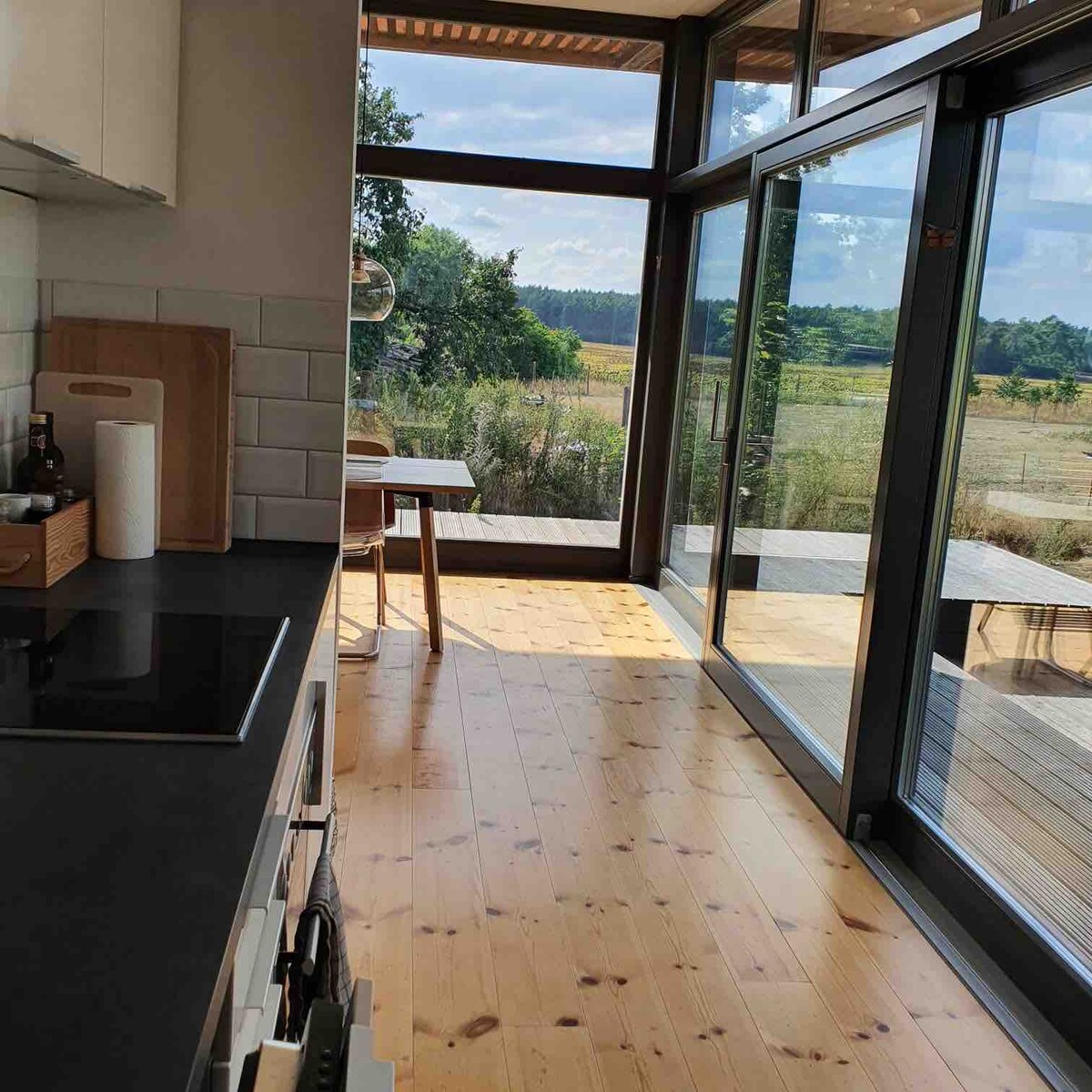 Drvena kuća modernog dizajna u umetničkom selu Ilou, 50 km od Berlina, sa 65 m² stambenog prostora i natkrivenom terasom od 35 m². Velike prozorske fasade i peć na drva u dnevnom boravku pružaju panoramski pogled na polja i šume. Potpuni mir, prikladno za pse. Dvije spavaće sobe, kupatilo. Priroda i obližnja jezera: Bukoverze (5 km), Tornovze (6 km), Rajhenoverze (3 km). Savršeno za samostalne putnike, parove, porodice i pse.