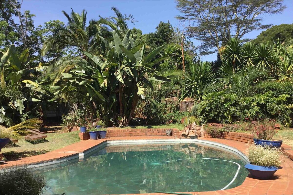 Smeštena u srcu Hararea, smeštena je seoska kuća sa grčkom tematikom, na pešačkoj udaljenosti od dva mesta za kupovinu i popularne lokalne pijace. Okružena vinovom lozom, avokadom, mangom i šapama, ova dobro nameštena seoska kuća sa besplatnim bežičnim internetom idealno je mesto za opuštanje ili da pronađete inspiraciju za sledeći roman. Istražite prelepu zemlju Zimbabve, sa udobnih zidova naše seoske kuće.