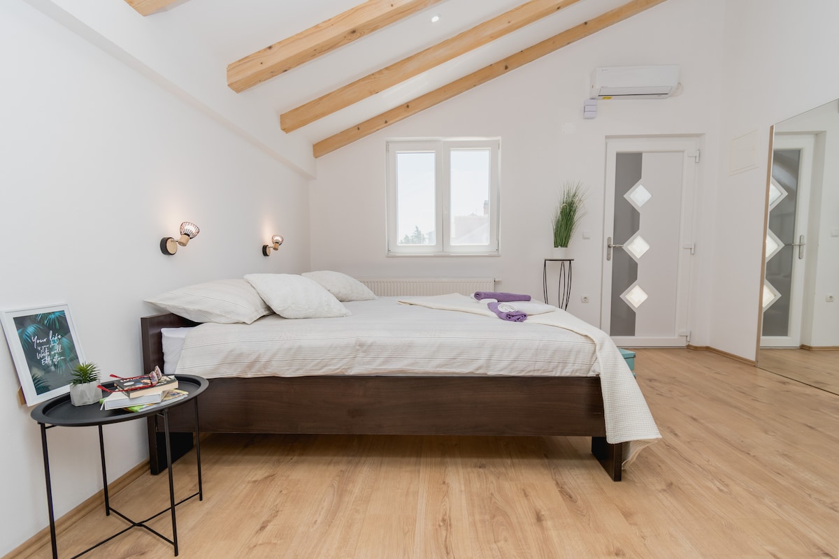 Stan se nalazi u glavnoj ulici u starom gradu Skradinu, samo 100 metara od obale i broda do vodopada KRKA. Uključena su 2x bicikla i SUP(veslanje na dasci). Mogućnost roštiljanja u autentičnom dalmatinskom stilu. ** Za više od 3noćenja - vožnja brodom na rijeci Krka ili riba na žaru ** Mediteranska terasa: - Roštilj - trpezarija i prostor za opuštanje Spavaća soba: - bračni krevet (širine 180-220 cm) - TV - klima-uređaj Dnevni boravak i spavaća soba 2: - Kauč/krevet za 2 osobe A/C Kuhinja Sport: -2 x bicikla - SUP