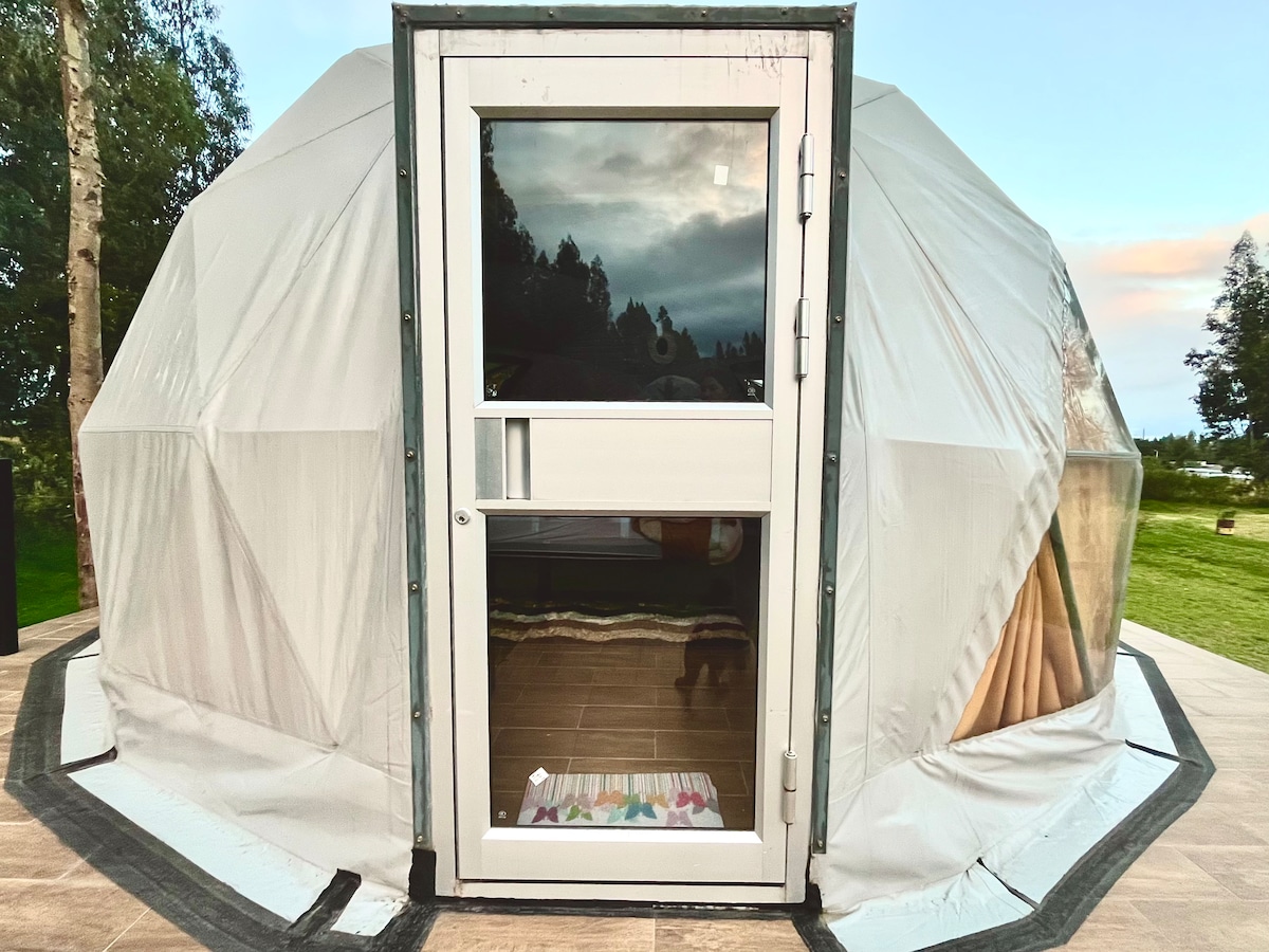 „Uživajte u jedinstvenom iskustvu u našem glampingu! Daleko od grada, okruženi prirodom i sa pogledom koji oduzima dah na veličanstveni Kotopaksi. Naše kupole su dizajnirane da vam ponude svu udobnost doma daleko od doma, uz dašak avanture i povezanosti sa prirodom. *Uživajte:* – Udoban i opuštajući san u udobnom krevetu – Spektakularan pogled na Kotopaksi iz sopstvenog kreveta – Pristup osnovnim i modernim sadržajima.